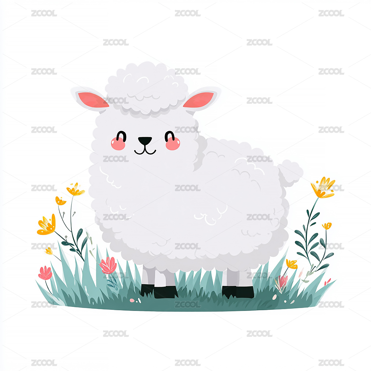 卡通可爱小羊在花丛中手绘元素