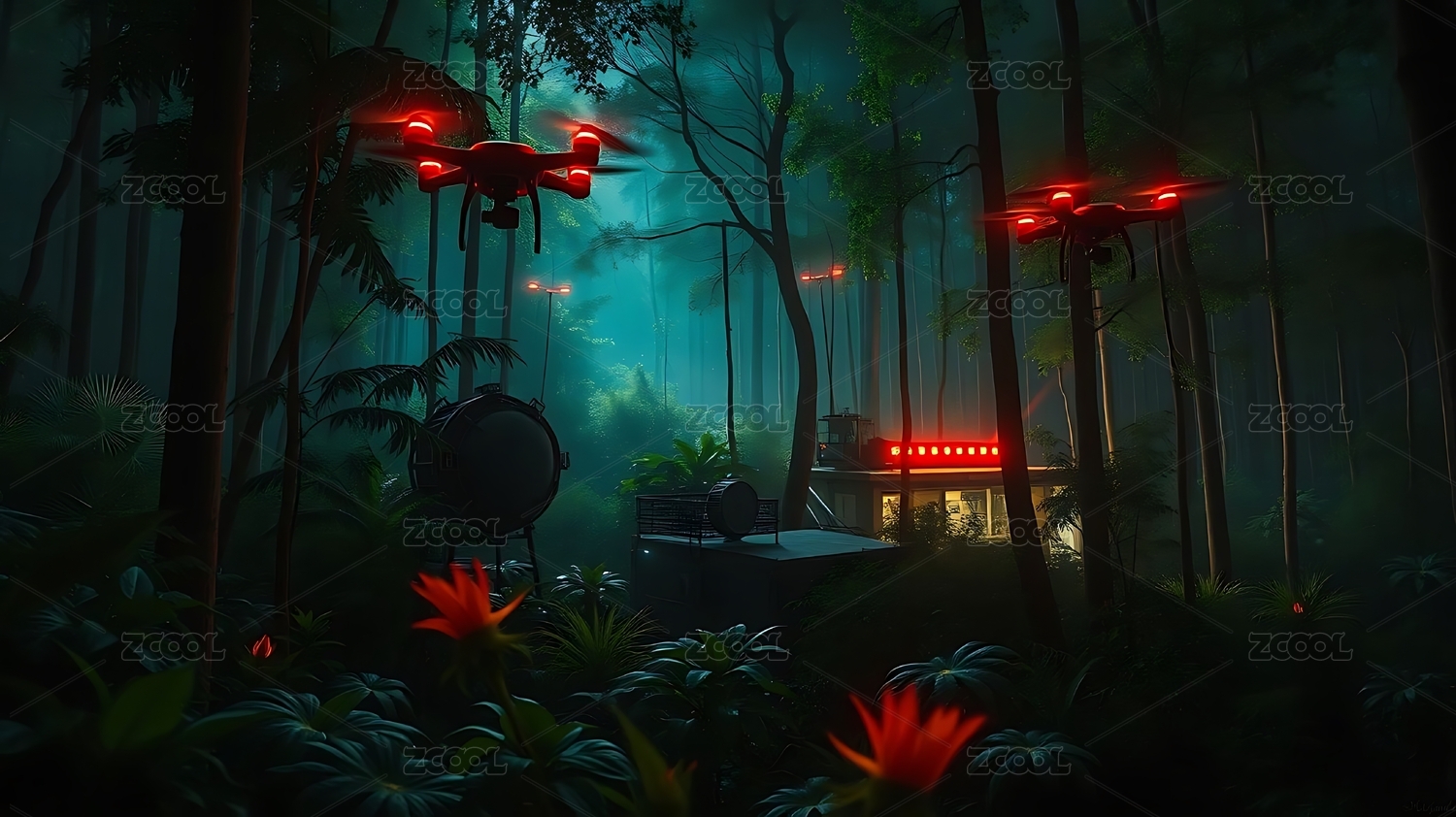 科技装置,热带雨林,发光效果,绿色植物,自然环境,未来感,圆形光环,夜晚场景,神秘氛围,先进科技