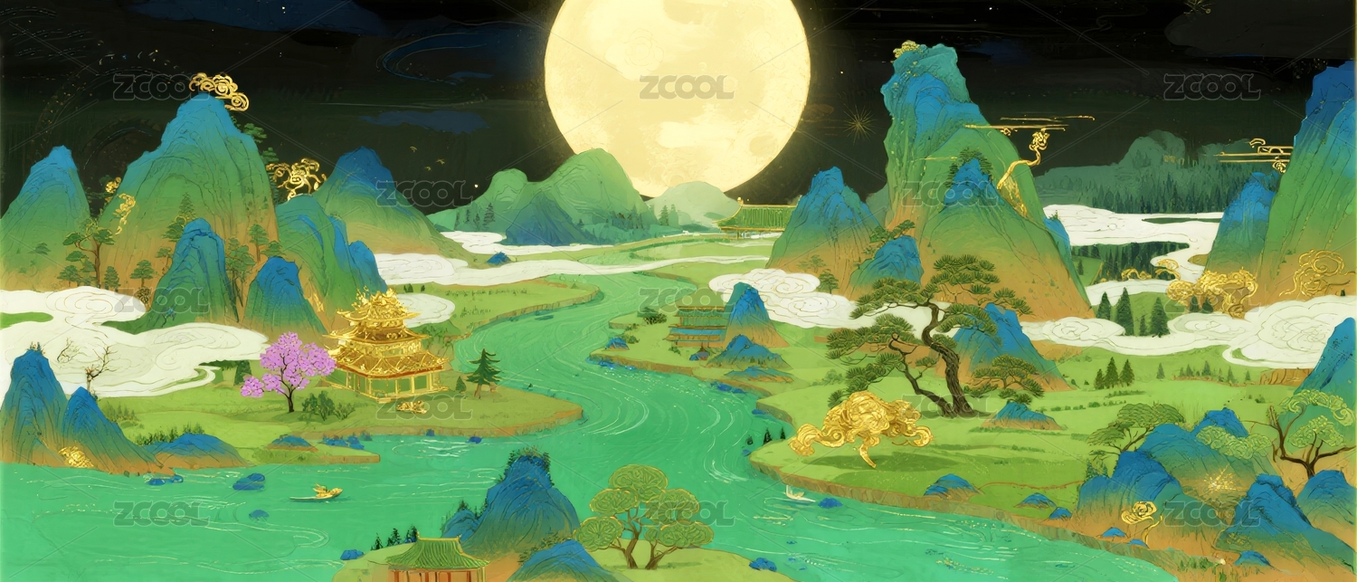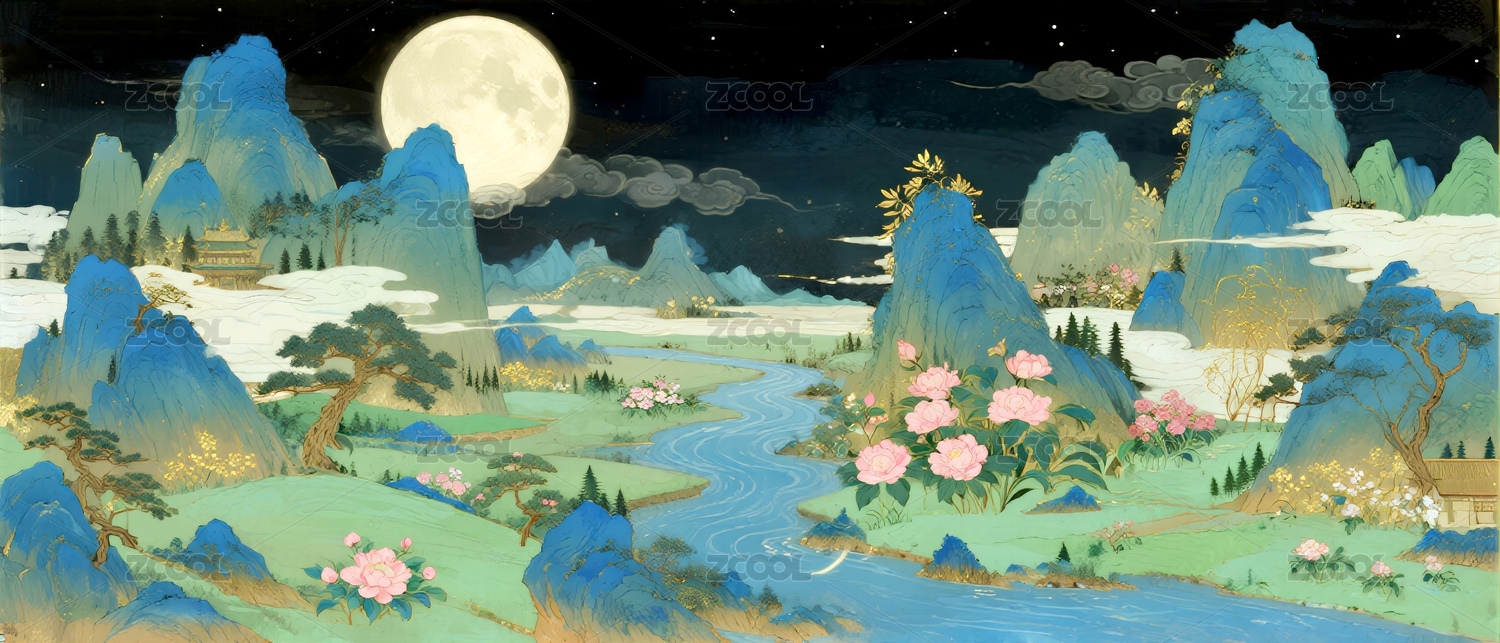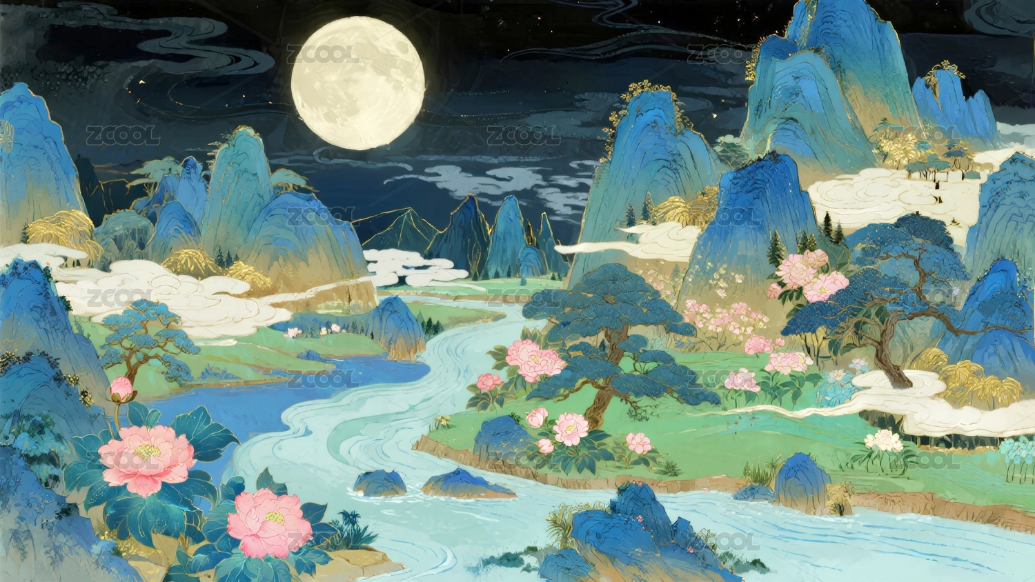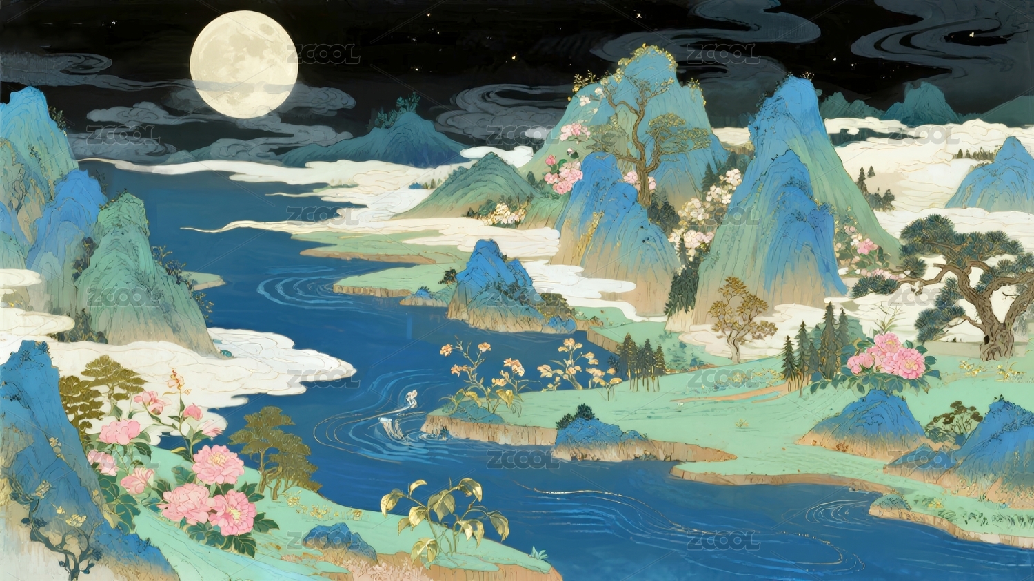 主视觉,商业,壁纸,背景,场景,山水,月色,国风,明月,河流