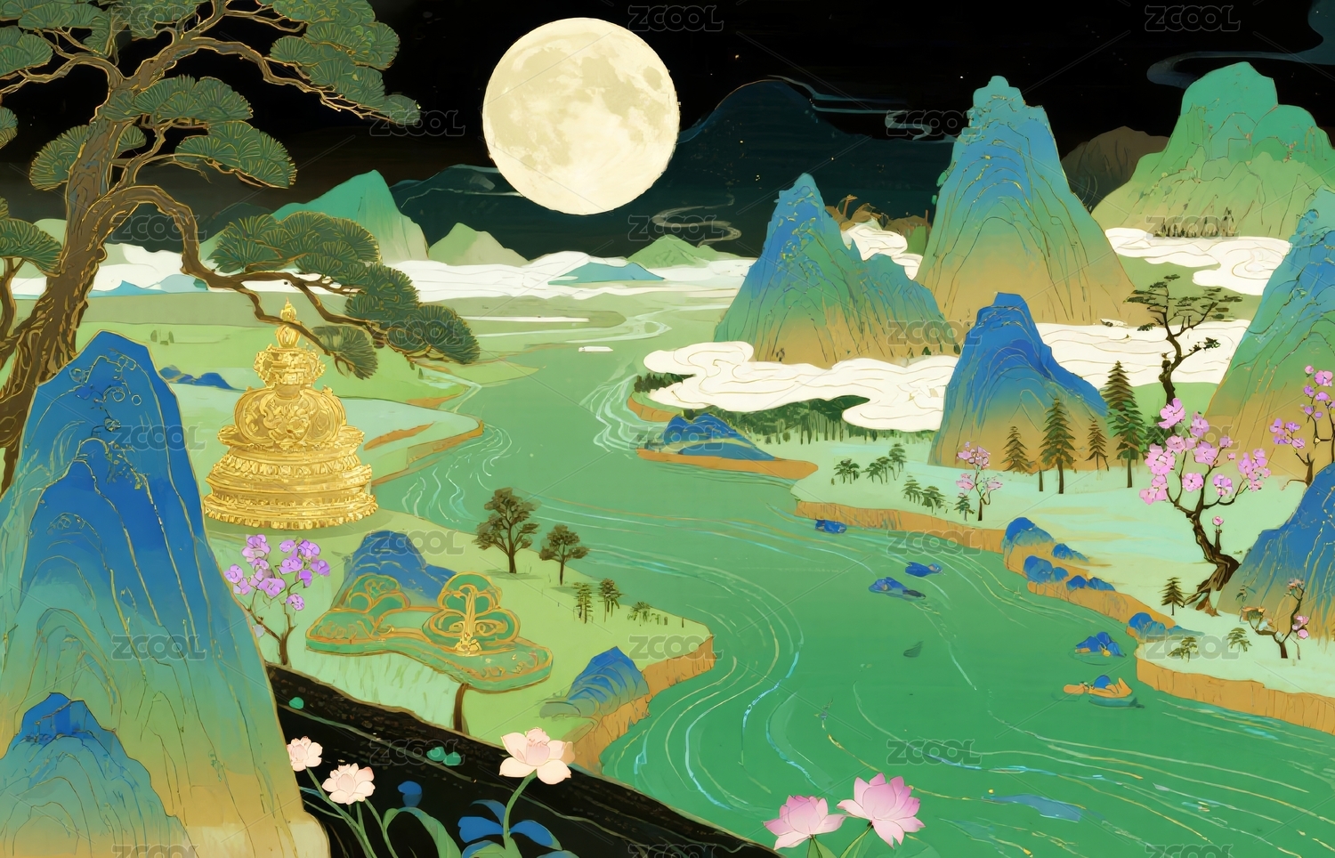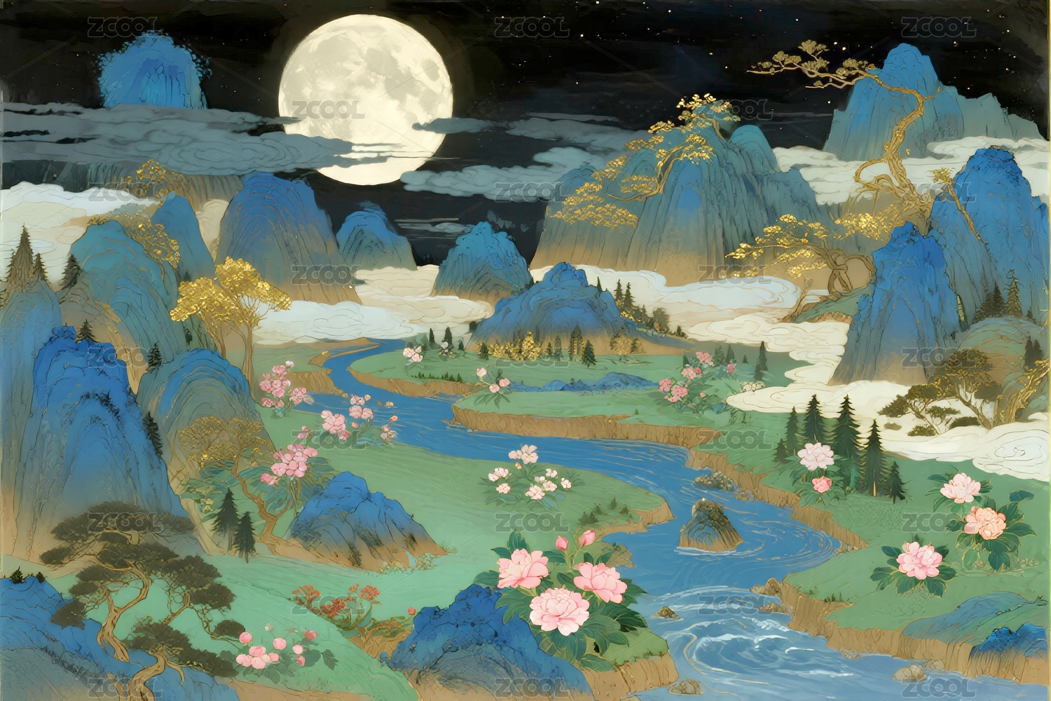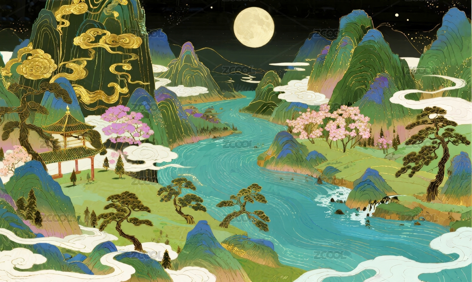 主视觉,商业,壁纸,背景,场景,山水,月色,国风,明月,河流