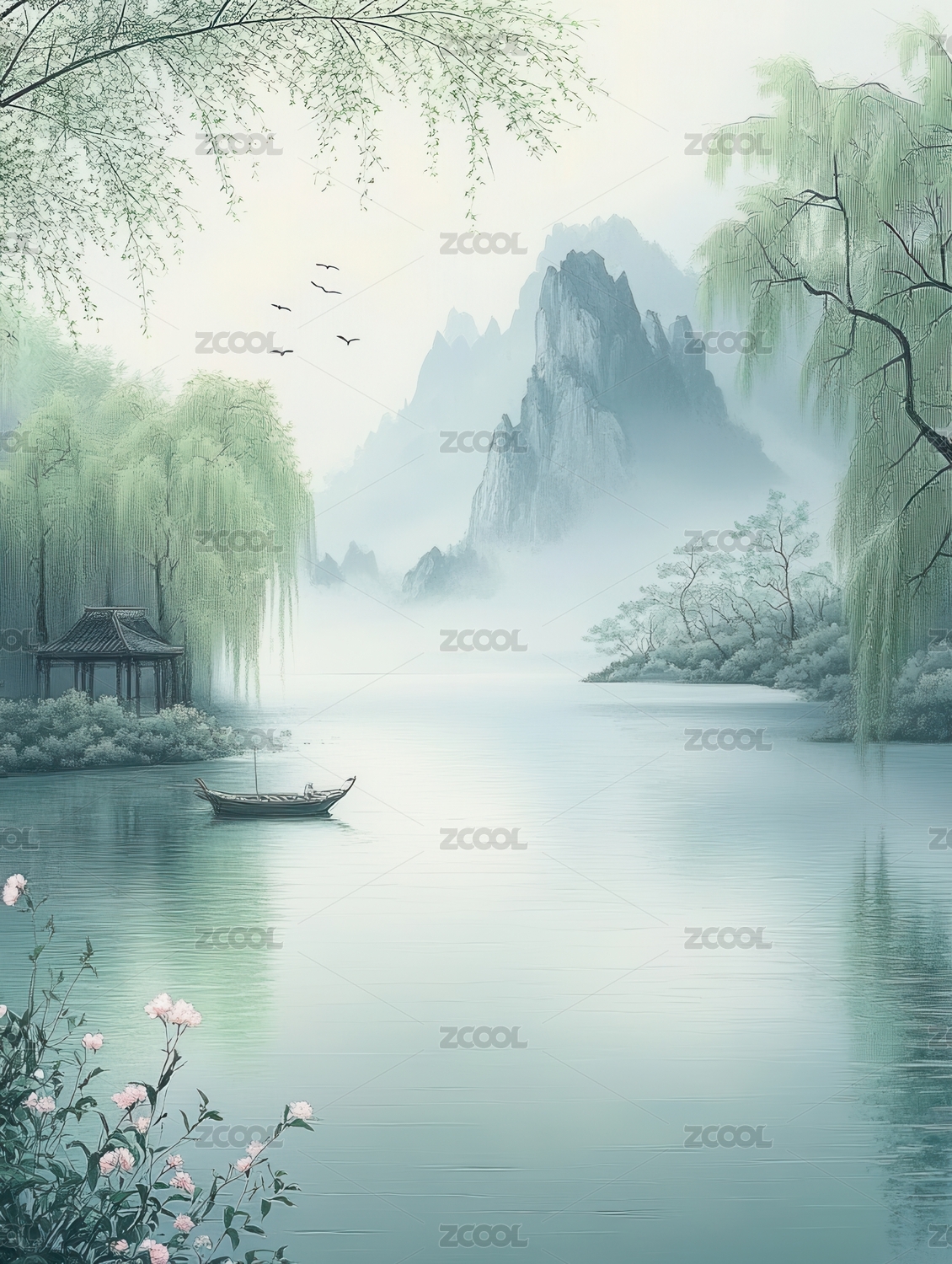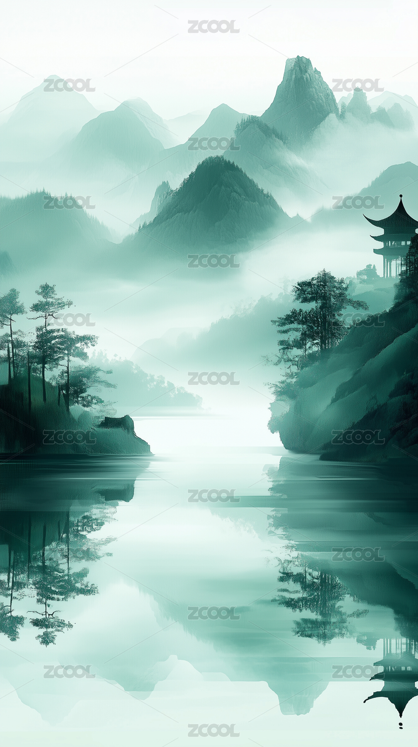 主视觉,商业,壁纸,背景,场景,山水,青绿,传统,艺术,插画