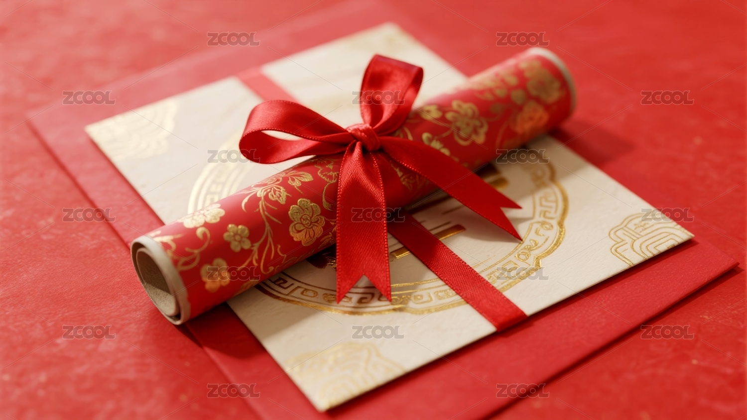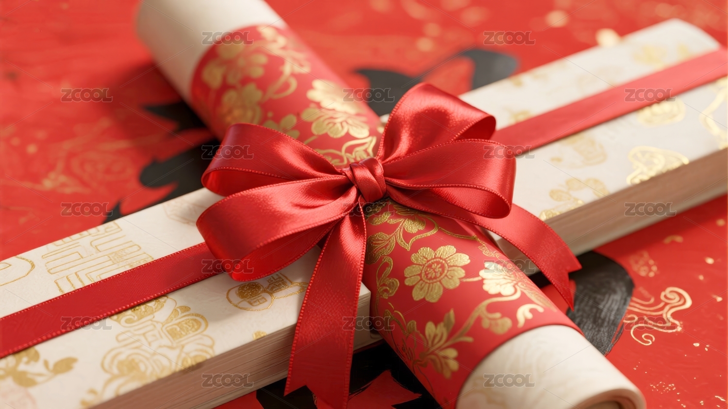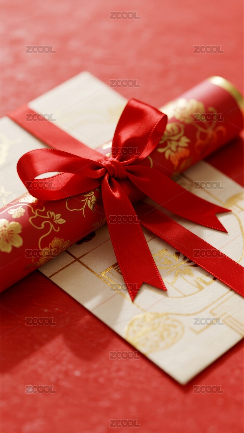 主视觉,商业,壁纸,礼盒,卷轴,喜庆,国风,场景,红色,丝带