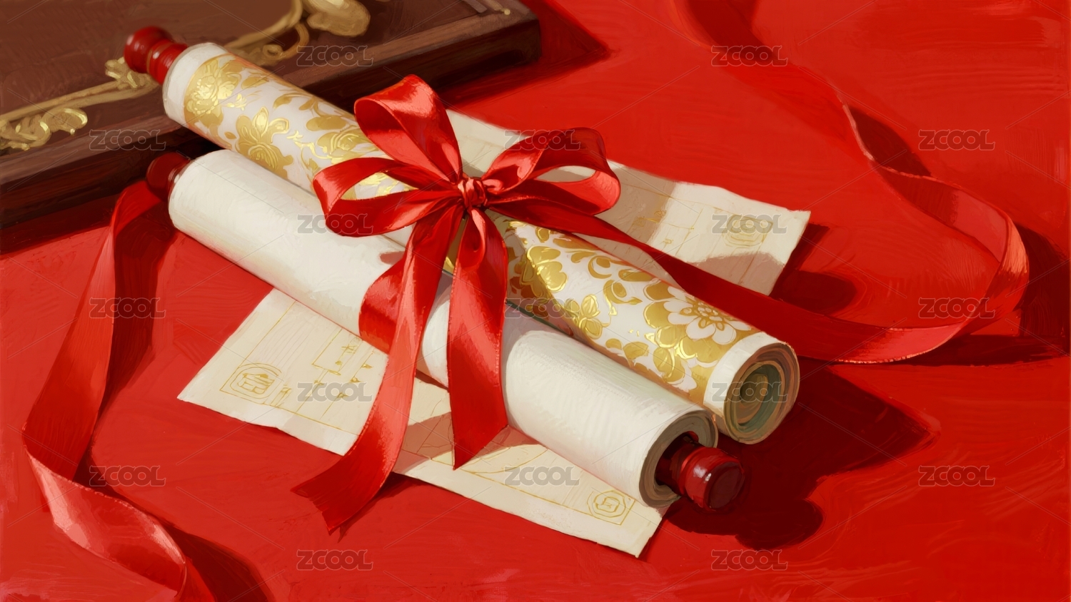 主视觉,商业,壁纸,礼盒,卷轴,喜庆,国风,场景,红色,丝带