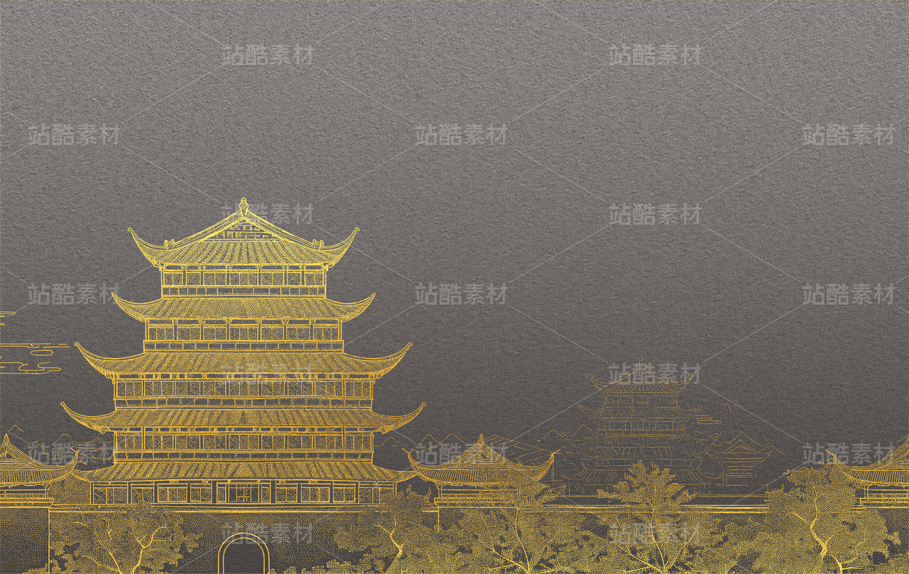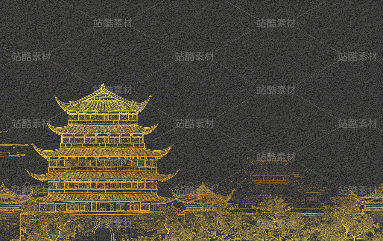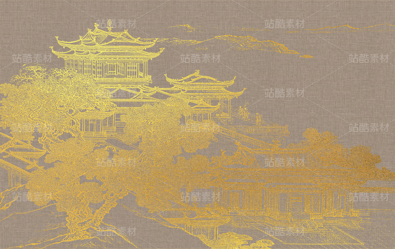 高清新款米灰布纹亭台楼阁新中式工装背景墙00