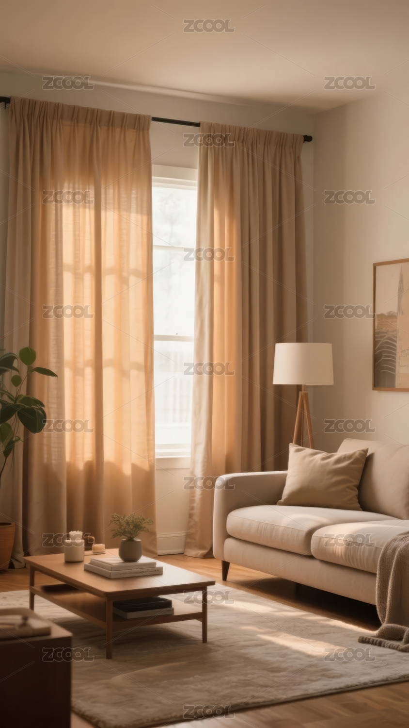 温馨客厅阳光透过米色窗帘洒在沙发和地板上