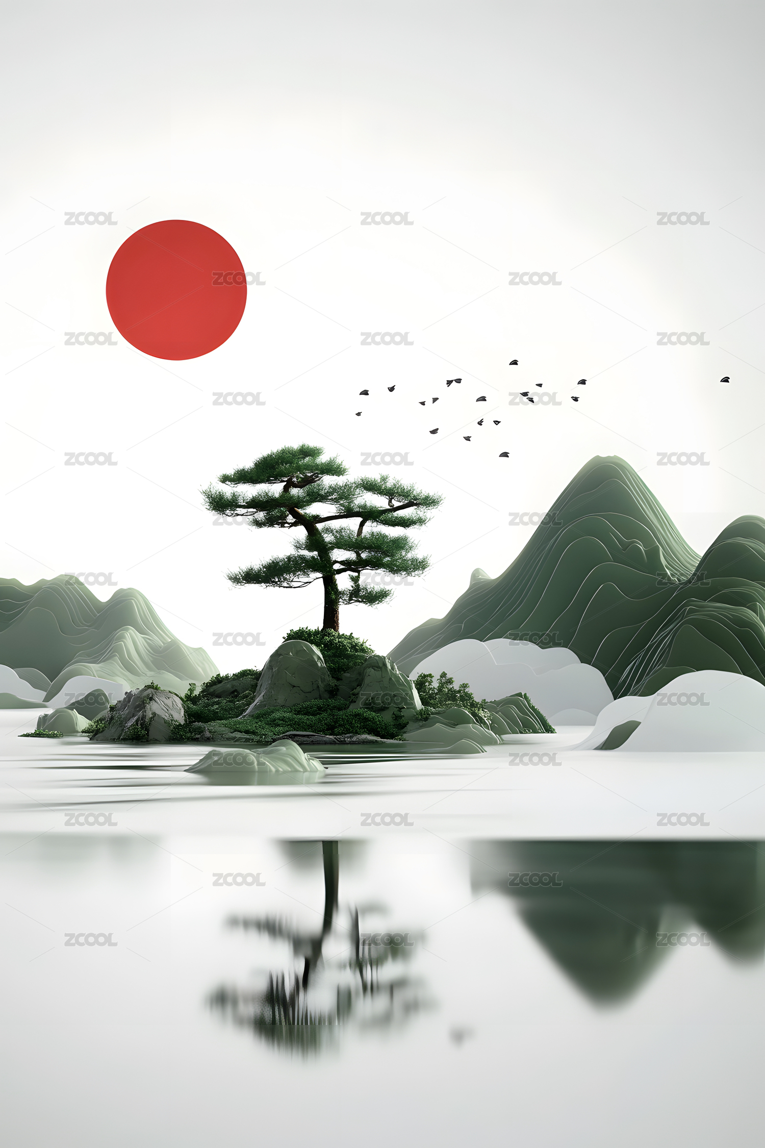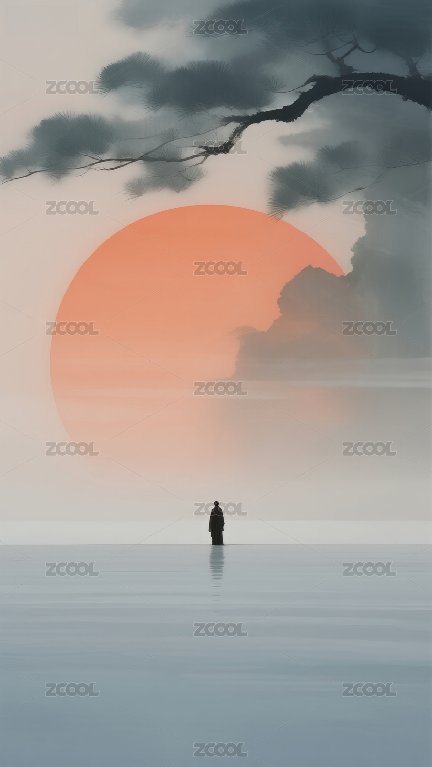 红日,一棵树,简约,插画,洁简风格,太阳,松树