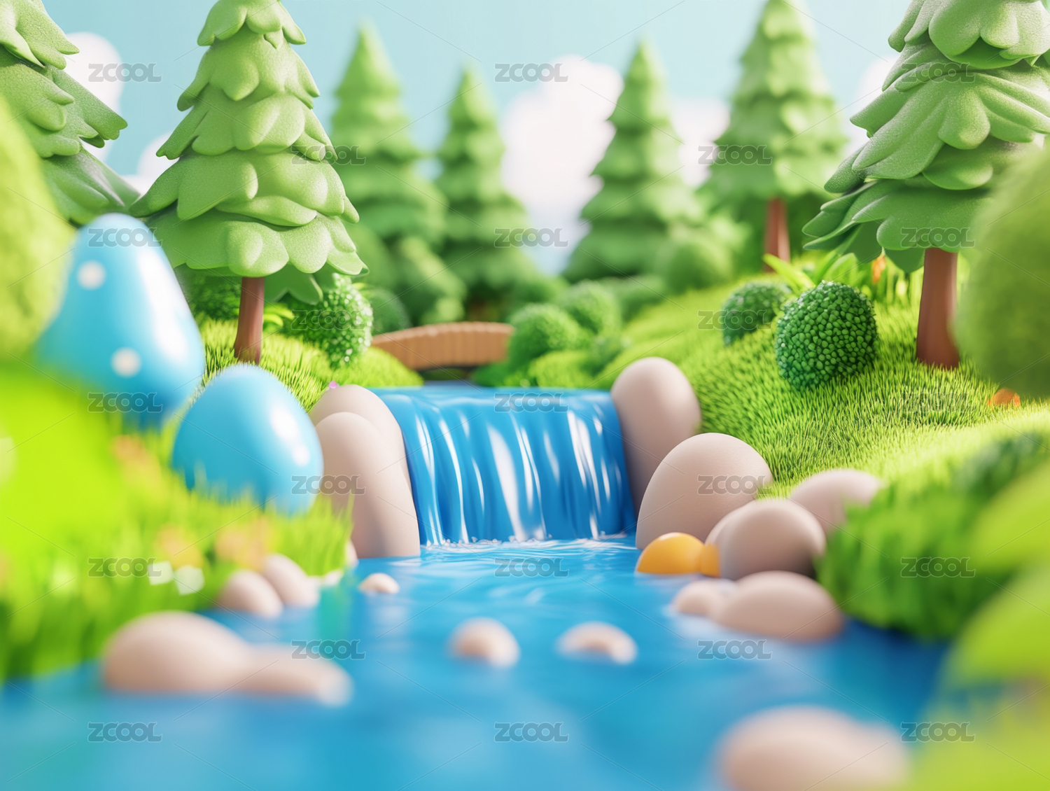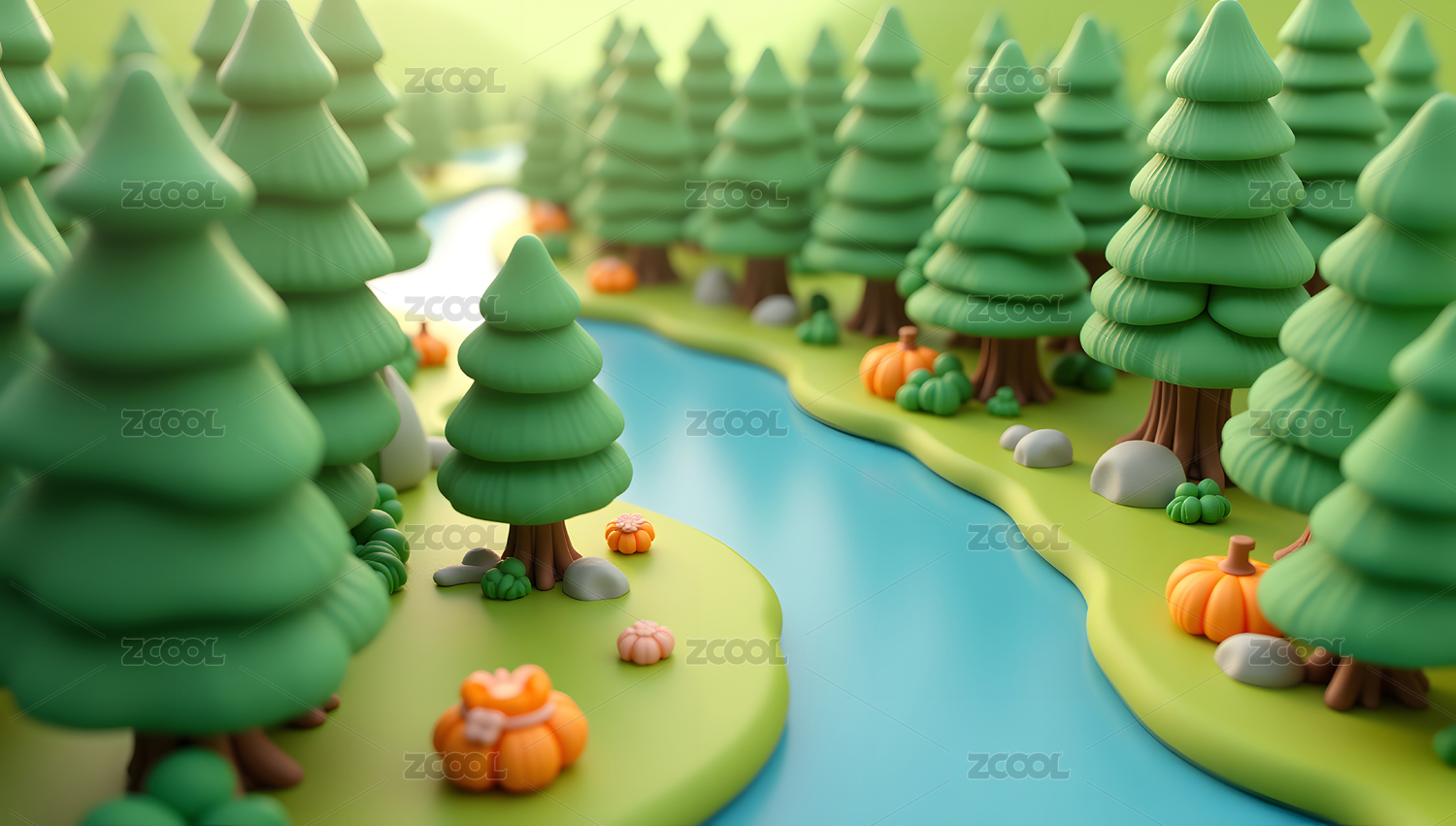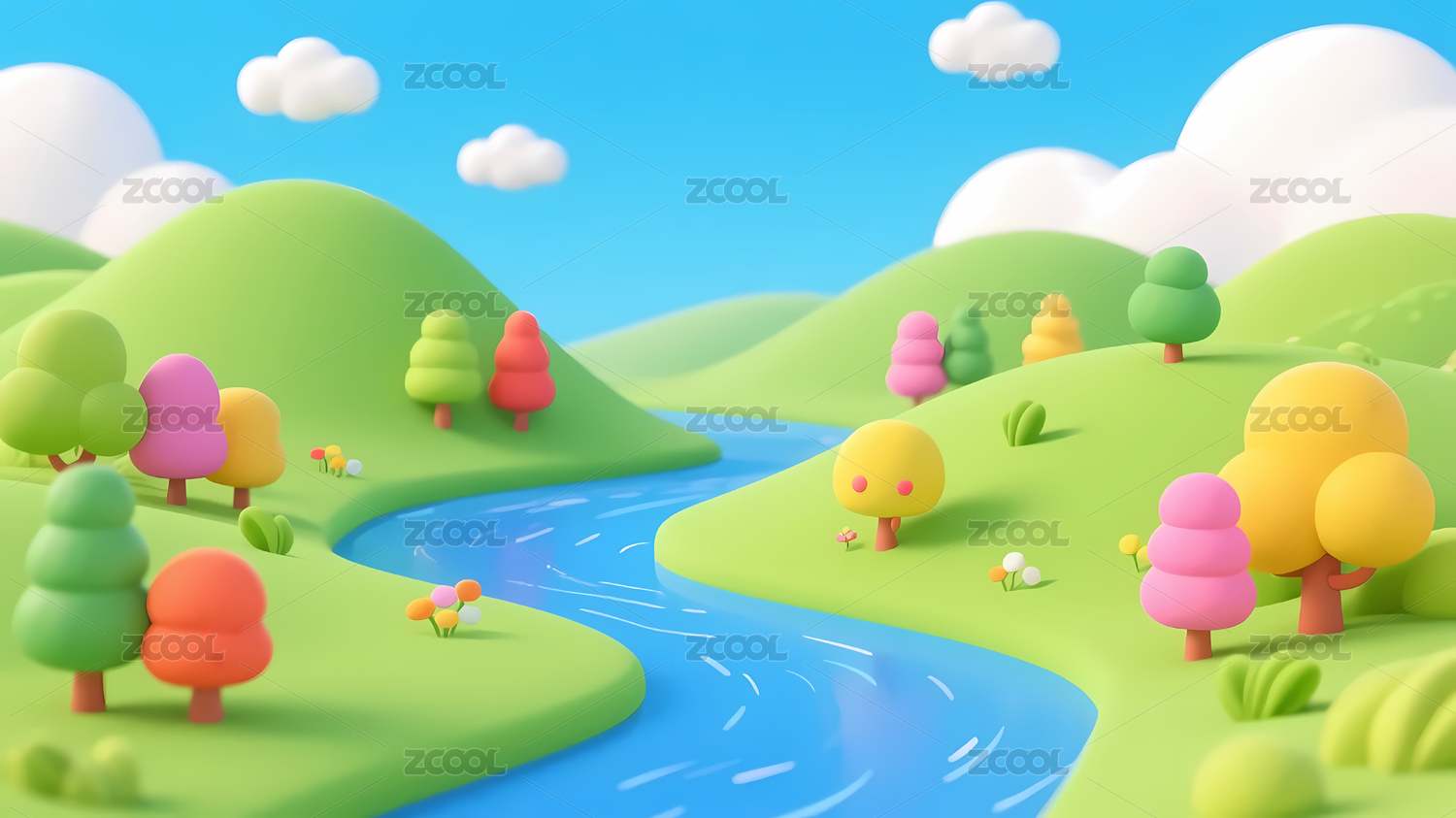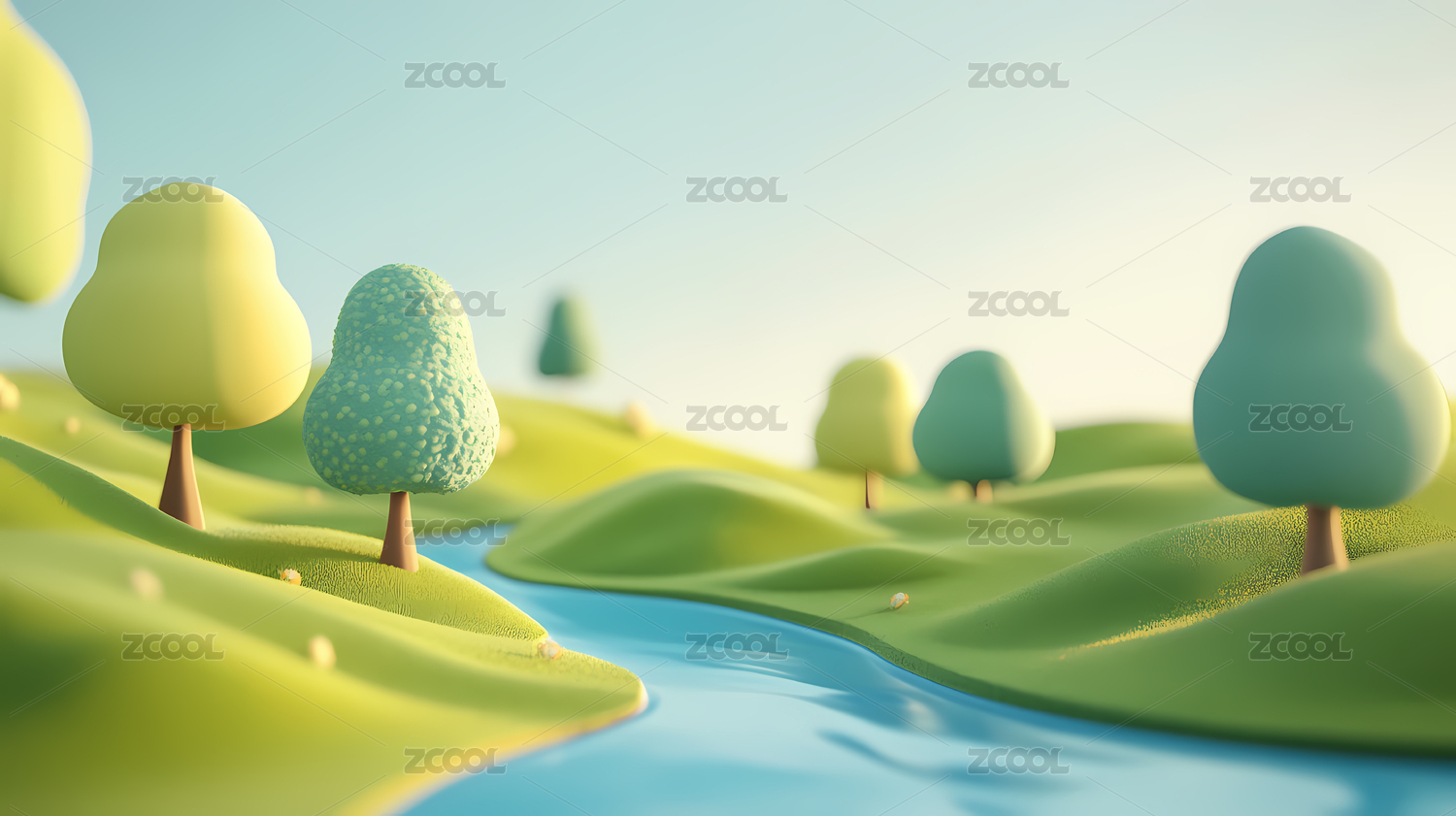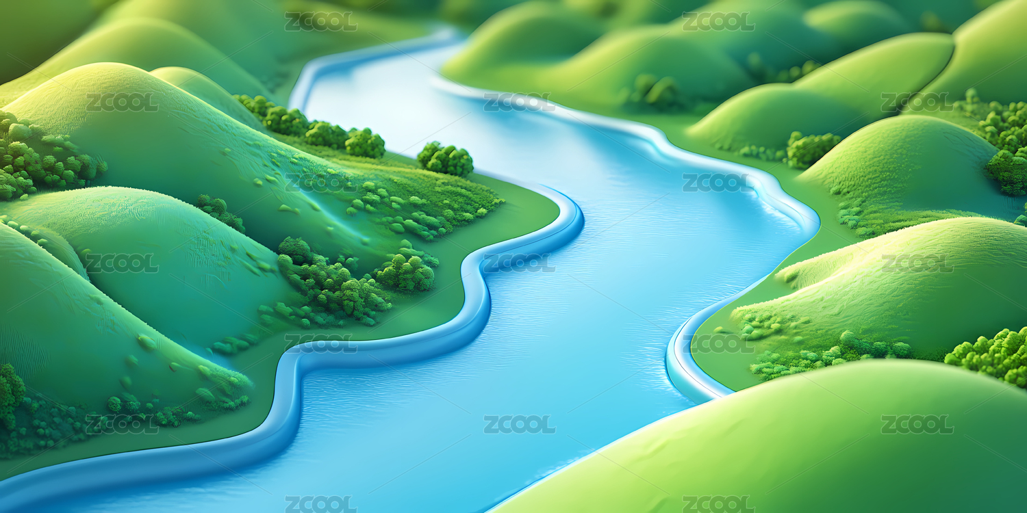 绿色的大堤中间蜿蜒的河流风景3D卡通插画