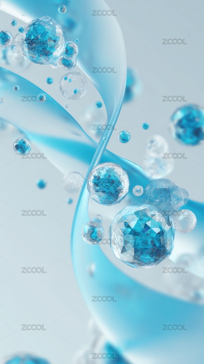 透明球体悬浮在蓝色背景中