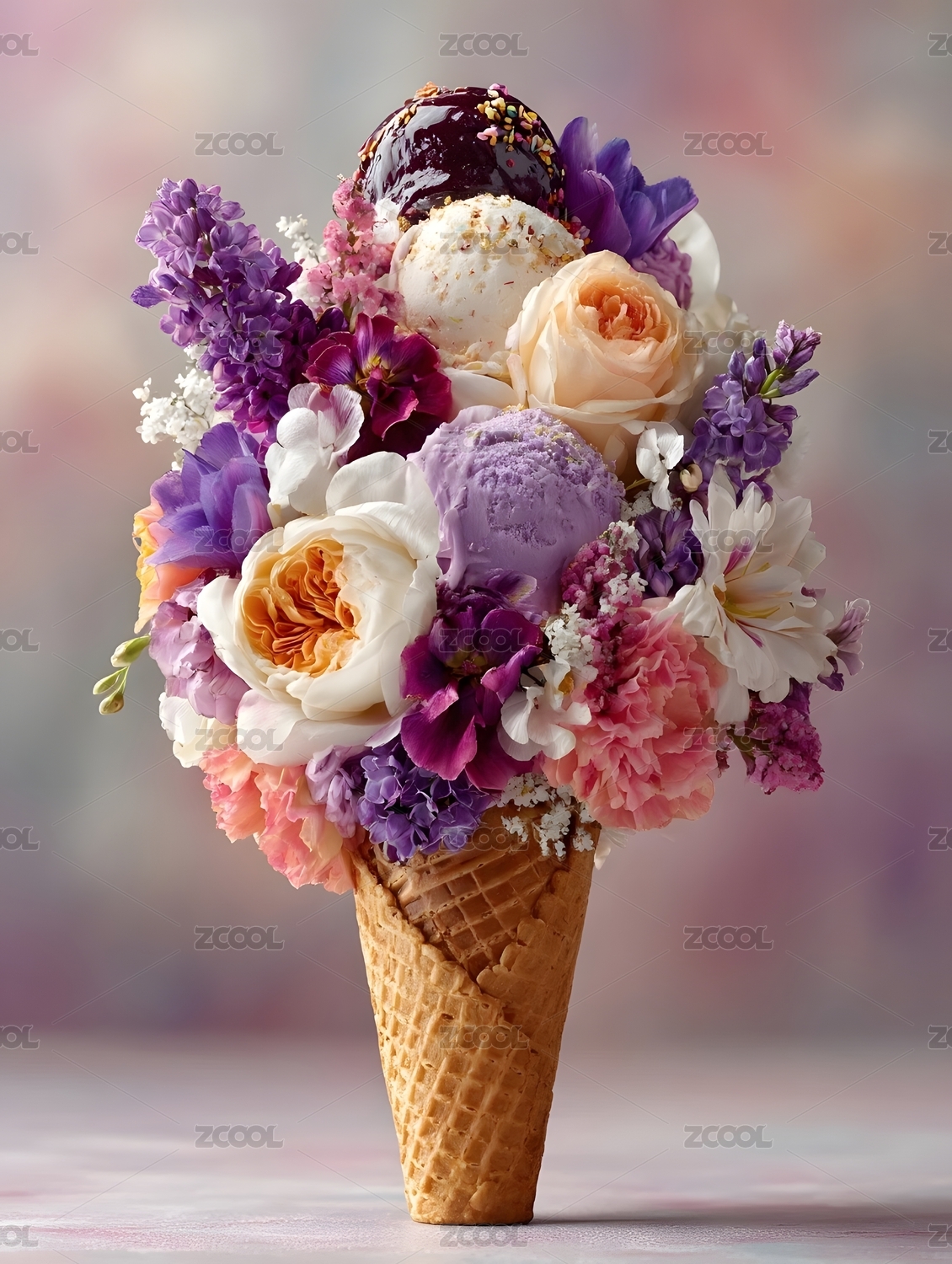 冰淇淋甜筒里的紫色玫瑰