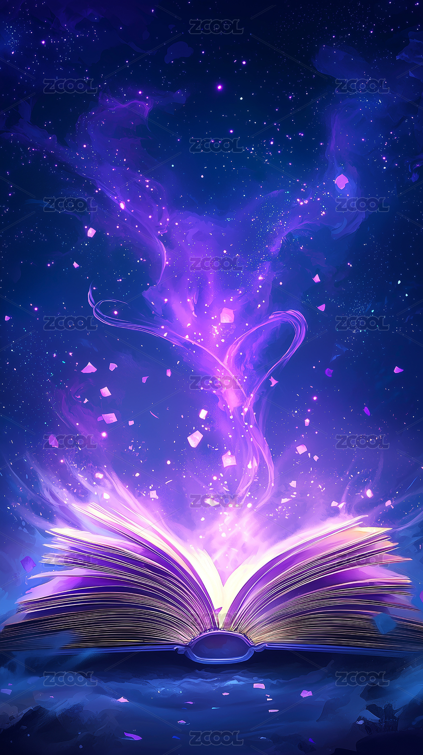 打开的书本上发出紫色的光芒