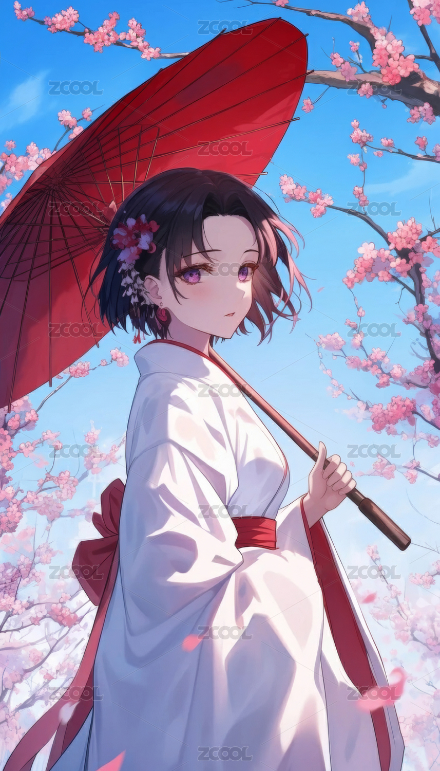 樱花树下撑着红伞的和服少女