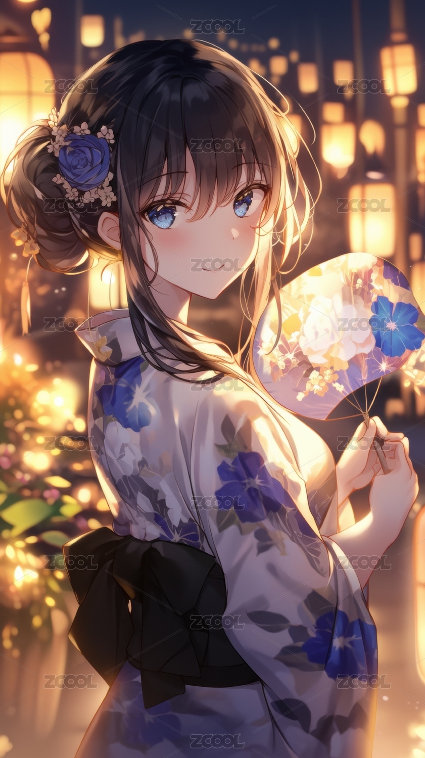蓝发少女身着和服背景灯光璀璨