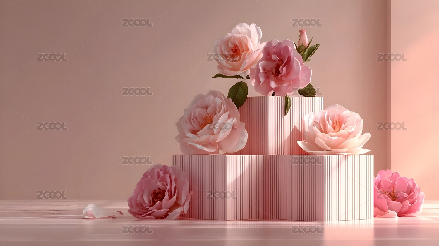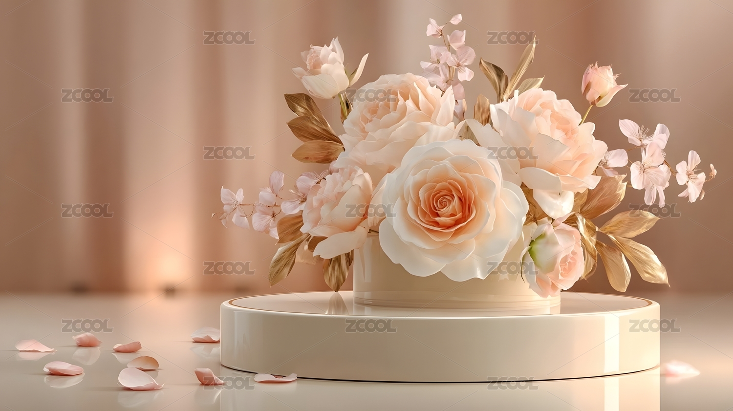 橙色背景唯美玫瑰花围绕中的圆形产品展台