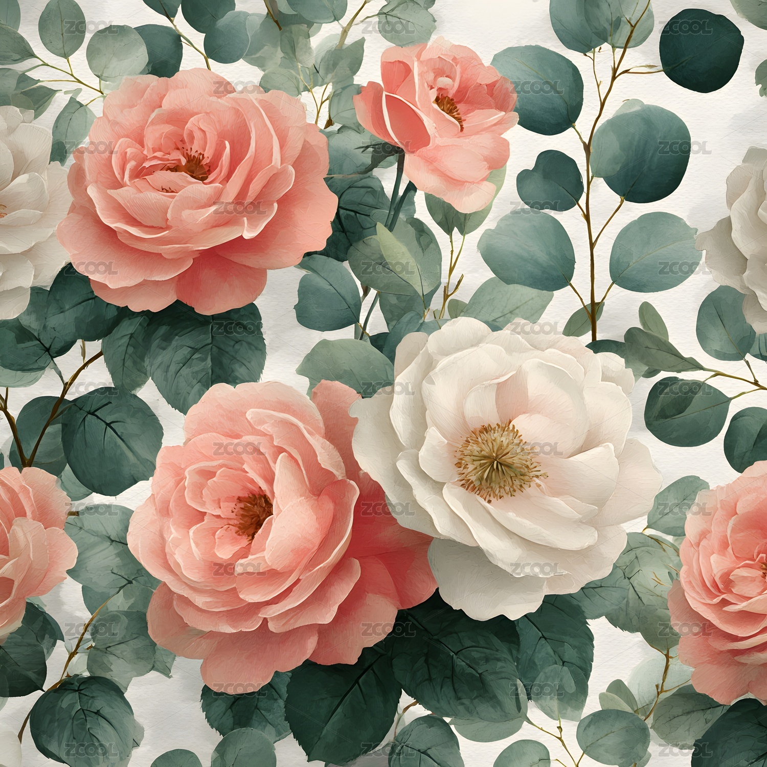 粉色玫瑰与绿叶花卉图案