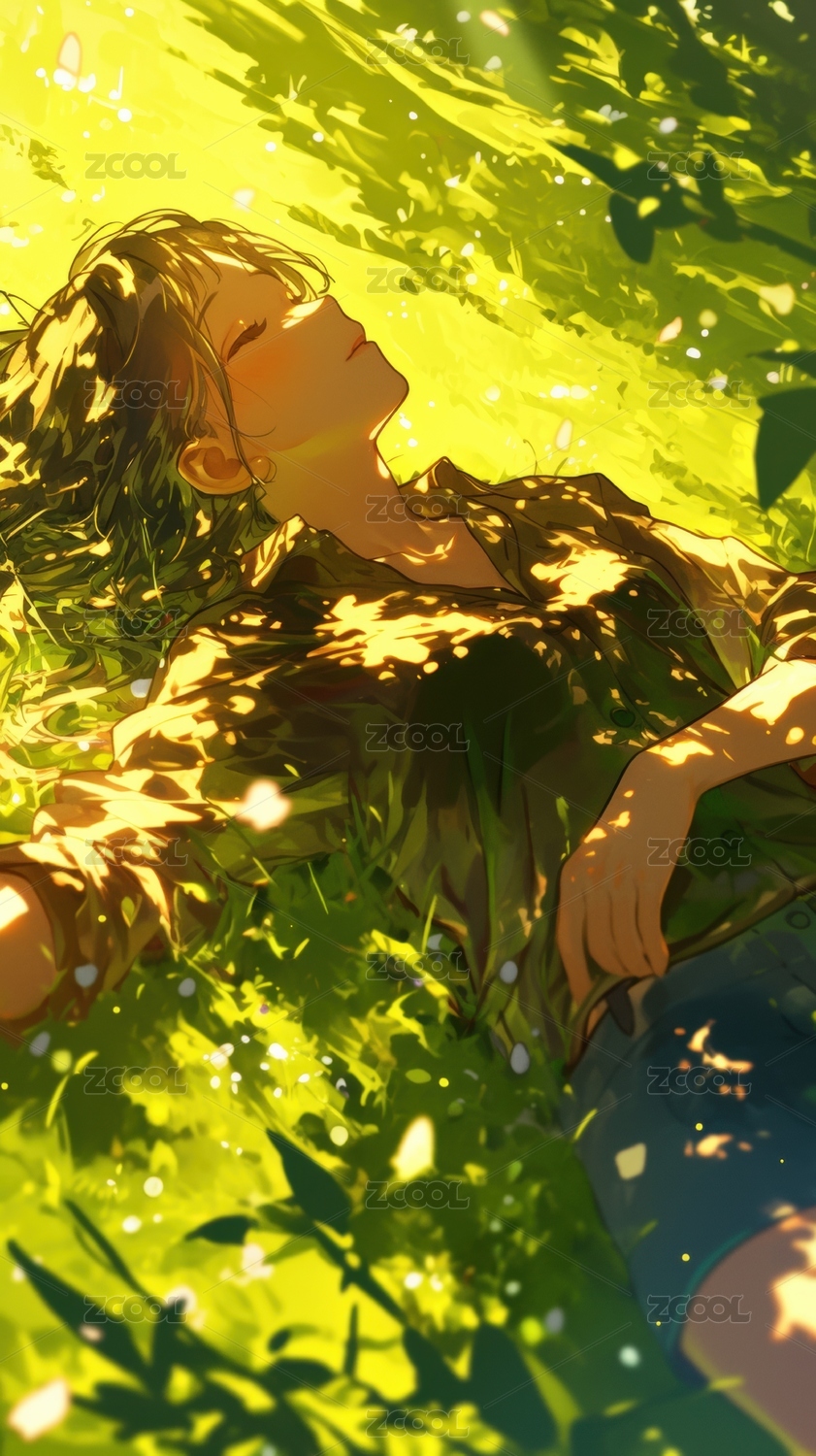 躺在花海草坪的女孩唯美插画