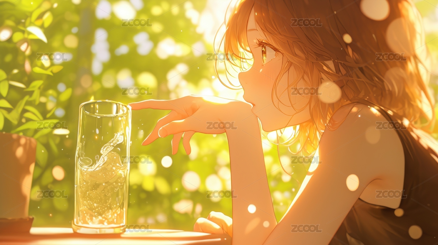 阳光下女孩轻触玻璃杯