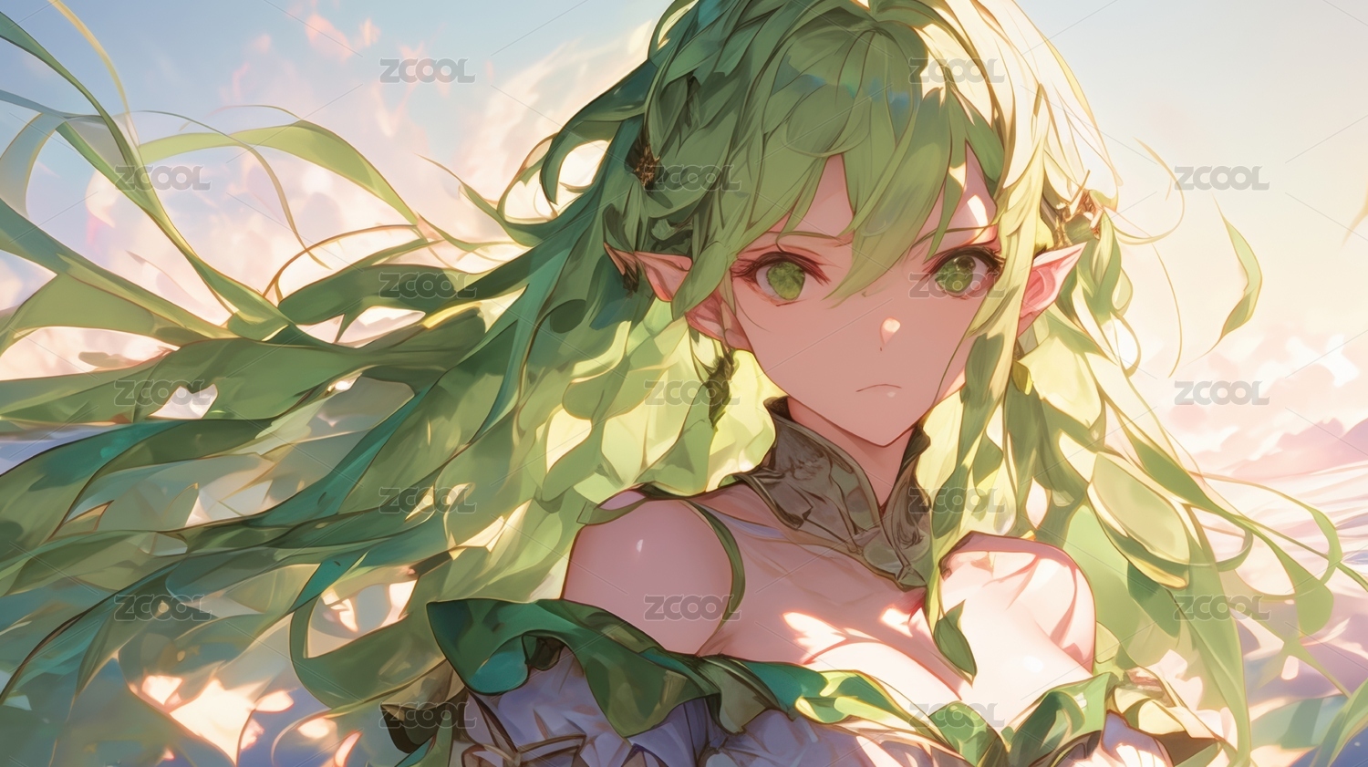 绿发精灵少女的梦幻姿态