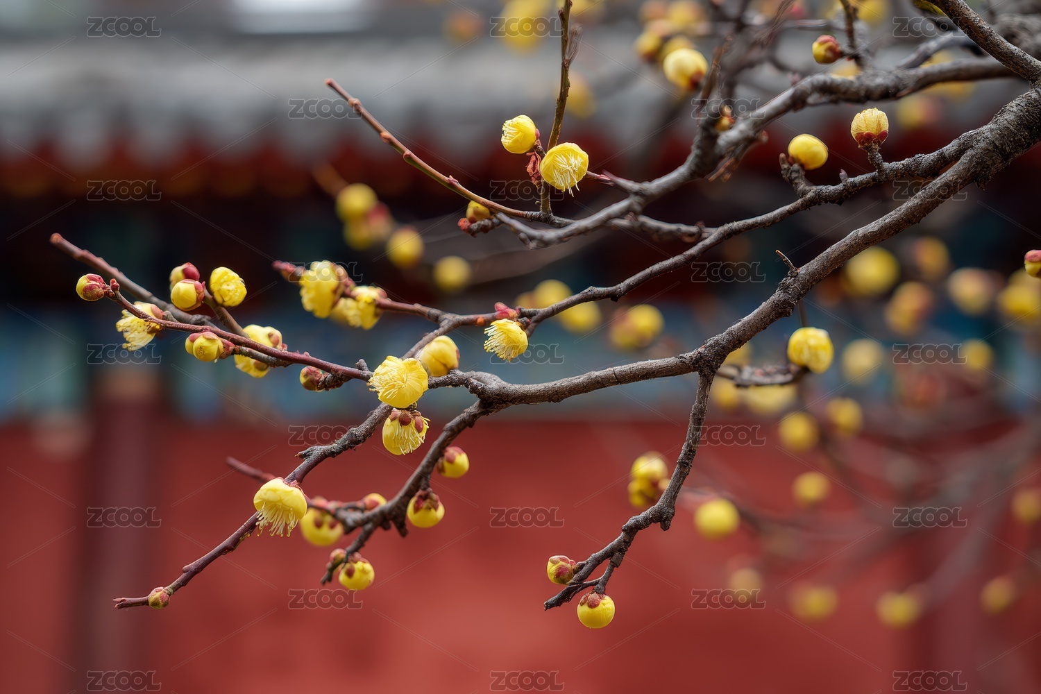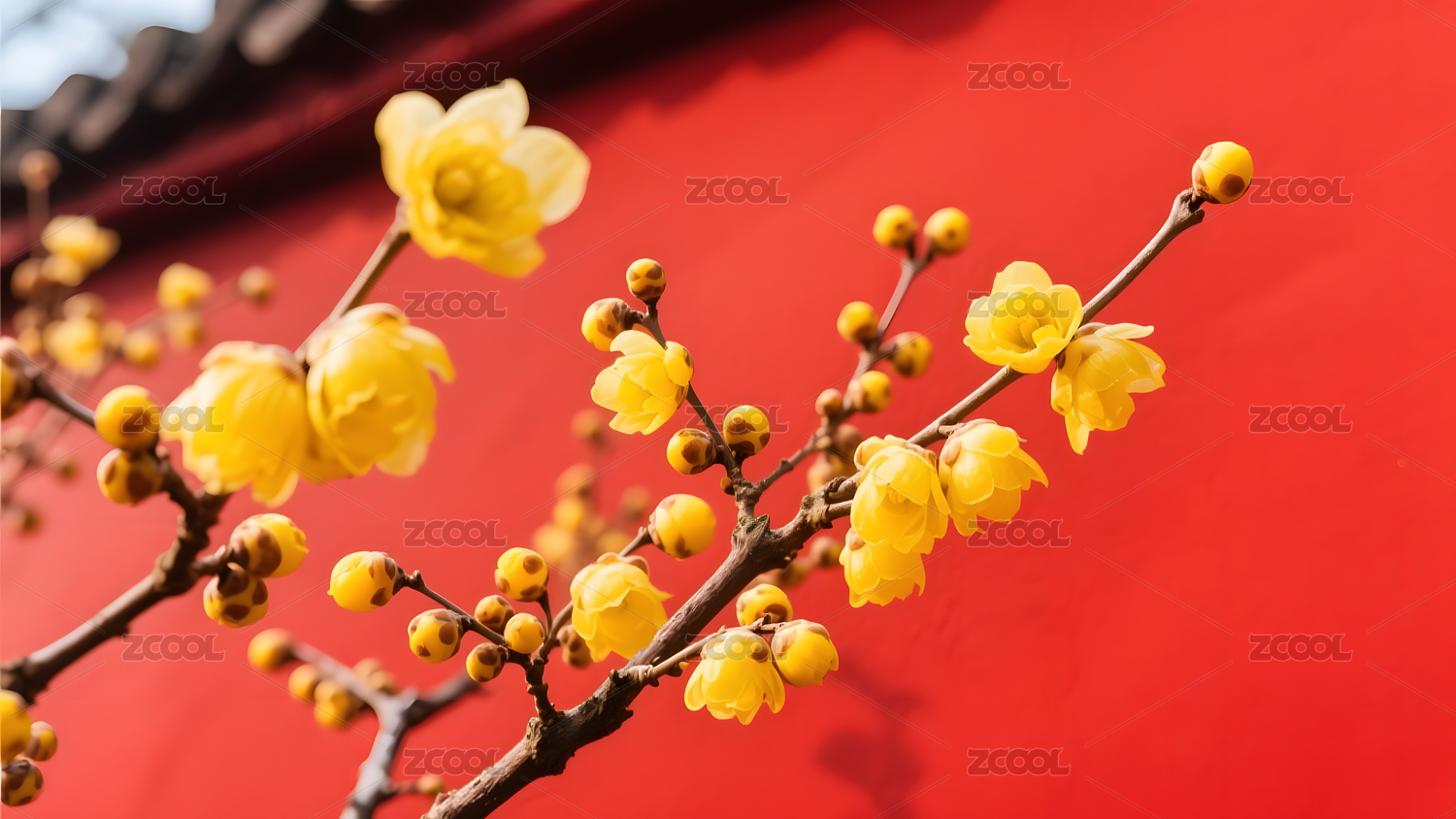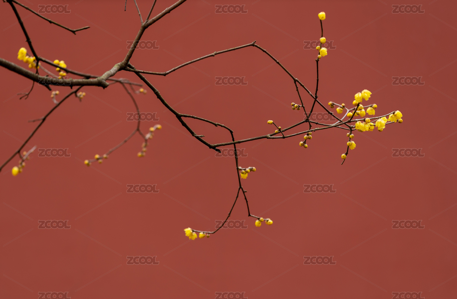 冬季,枝条,黄花,绽放,红墙,背景,古风,建筑,色彩,对比