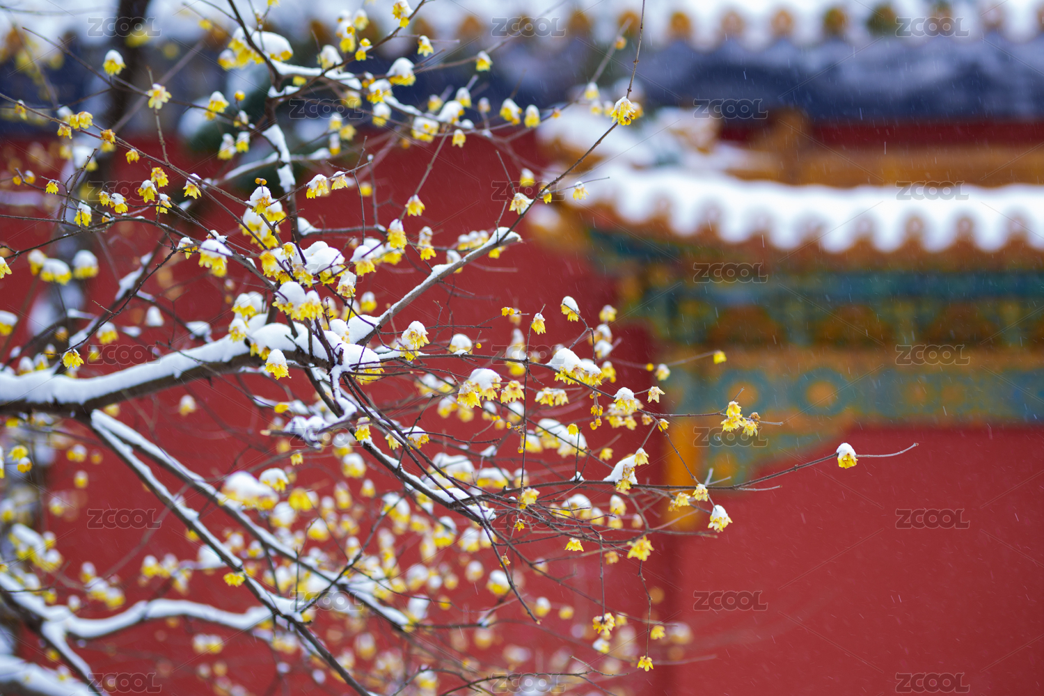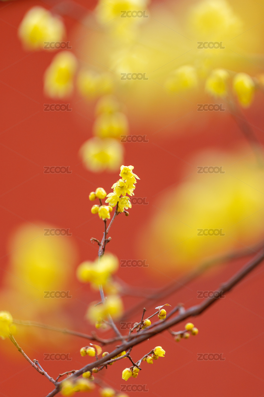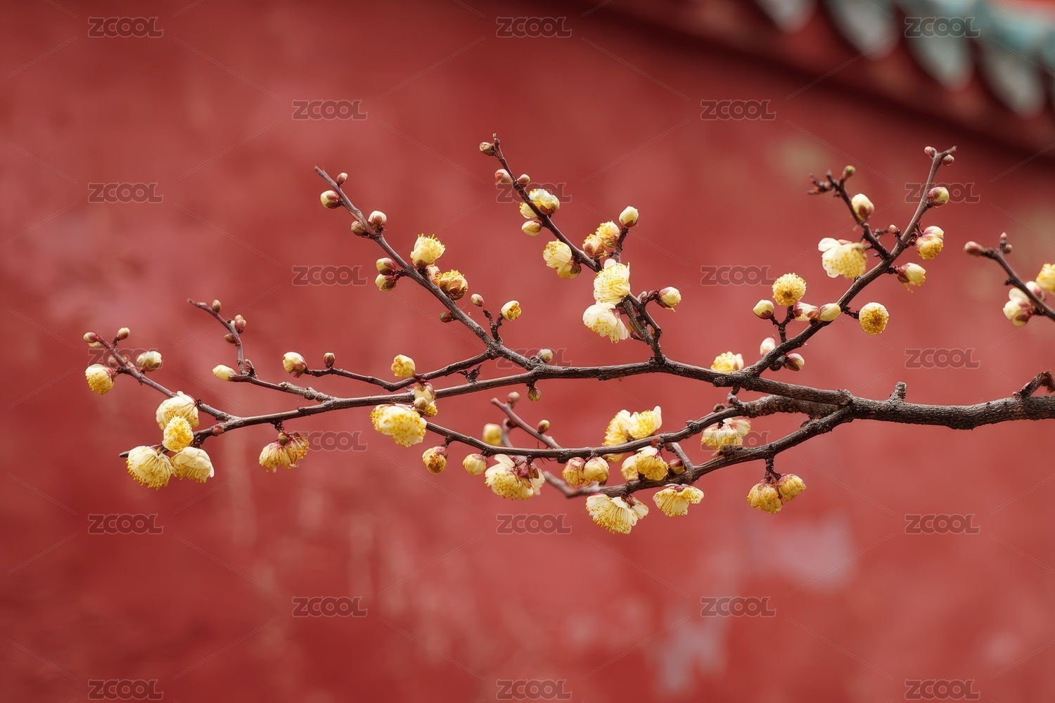 冬季,枝条,黄花,绽放,红墙,背景,古风,建筑,色彩,对比