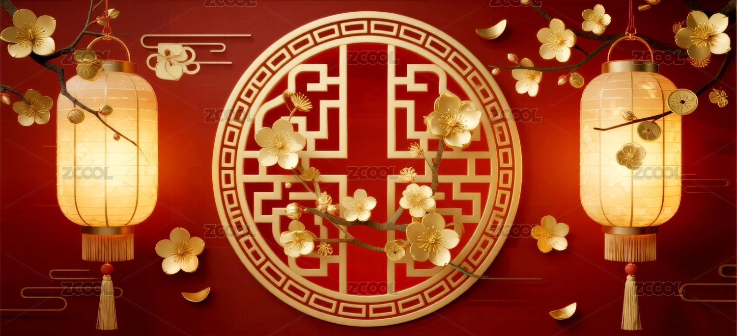 红色背景上的金色灯笼与花卉装饰