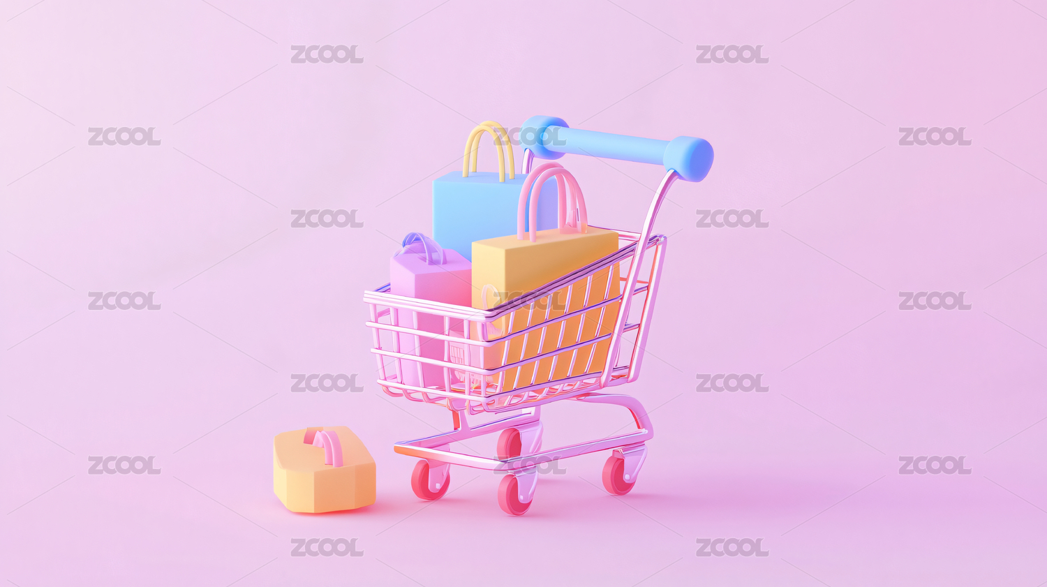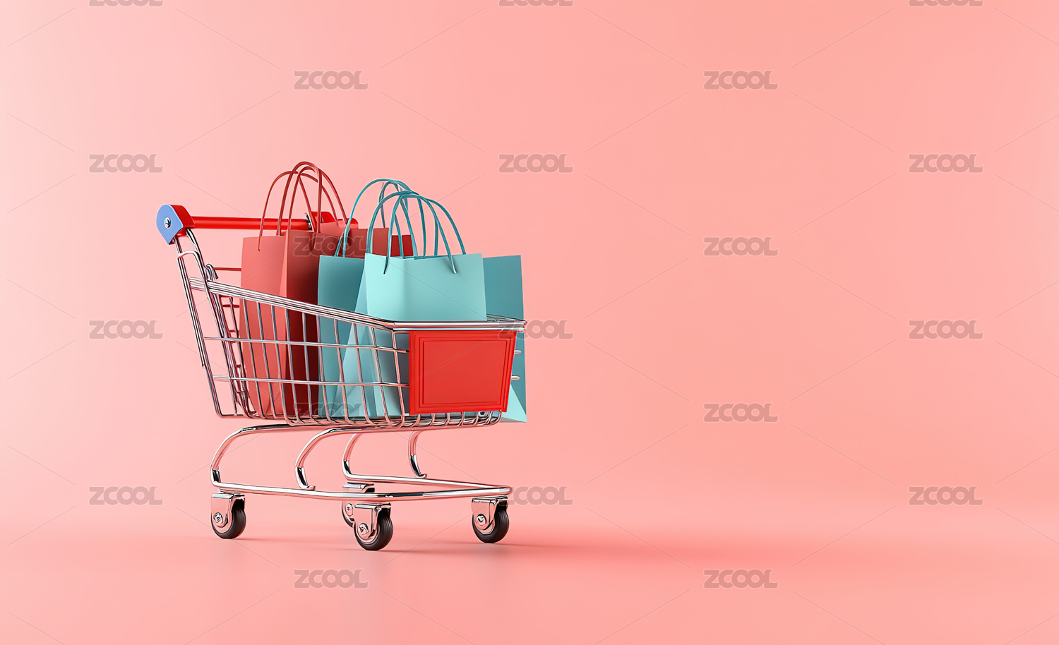 粉红色背景下购物车中彩色购物袋的特写镜头