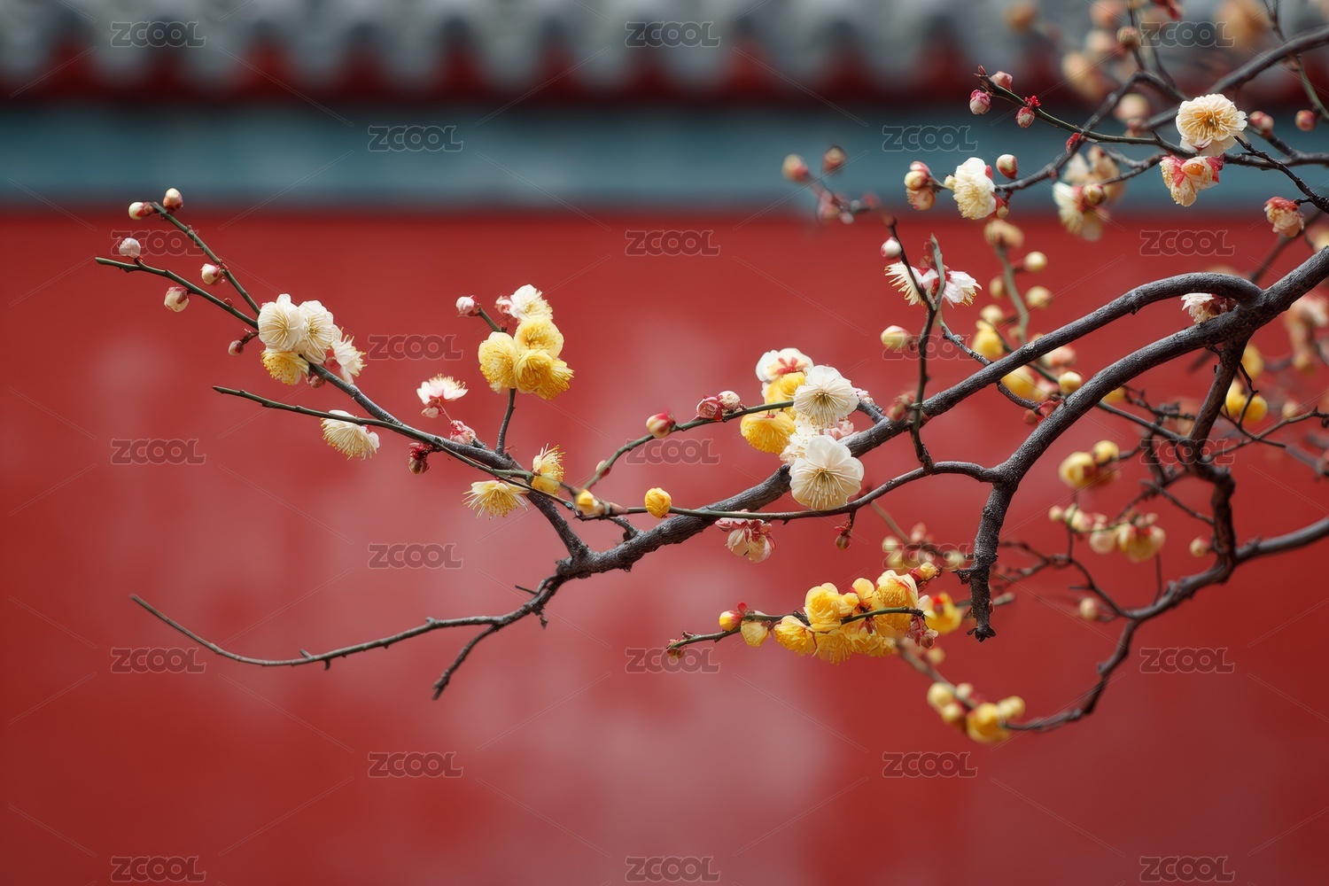 红墙,古建筑,自然美,对比,春天,花卉,枝条,古典,背景,盛开