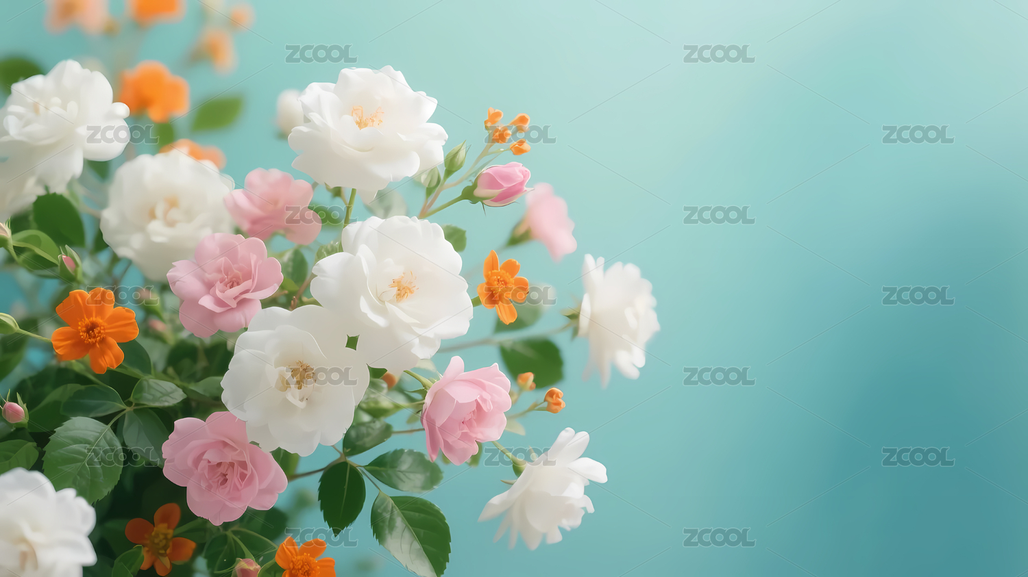 橙色,白色,背景,粉色,花朵,玫瑰,生机,鲜艳,优雅,蓝绿