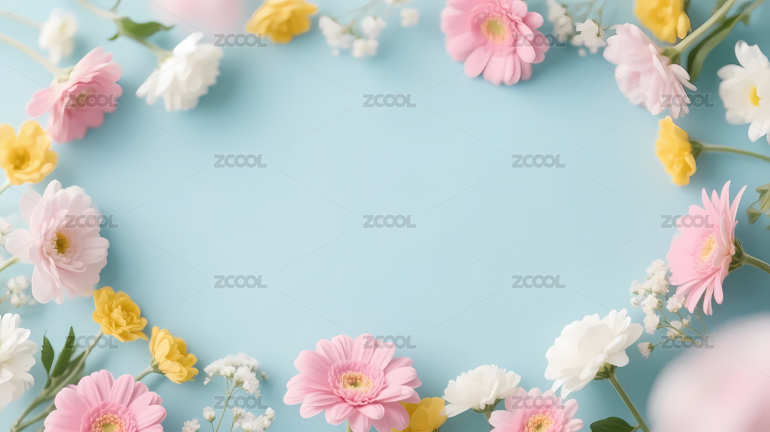 粉绿黄花边浅蓝背景