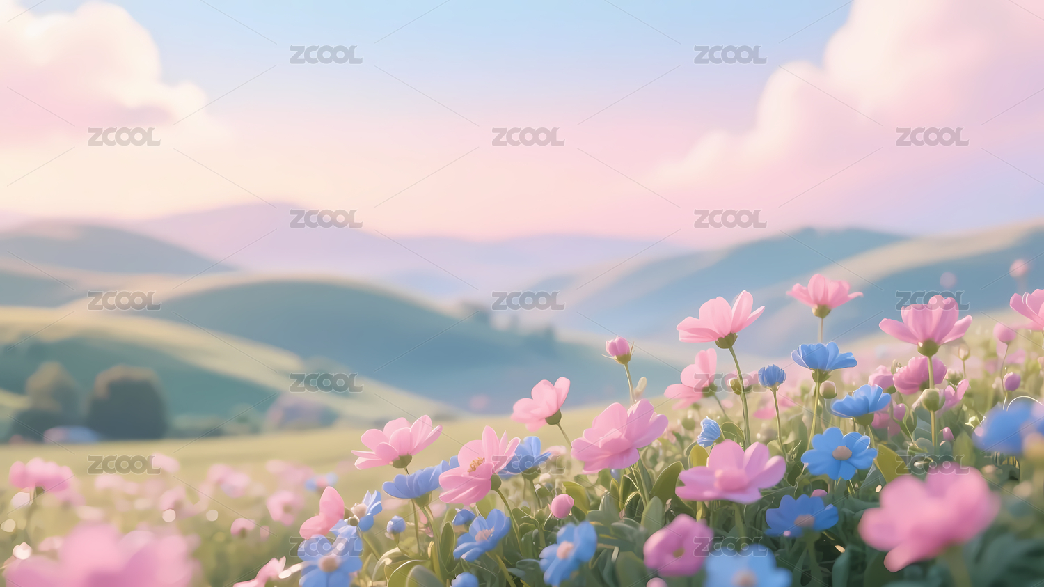 盛开花朵蓝粉山丘天空