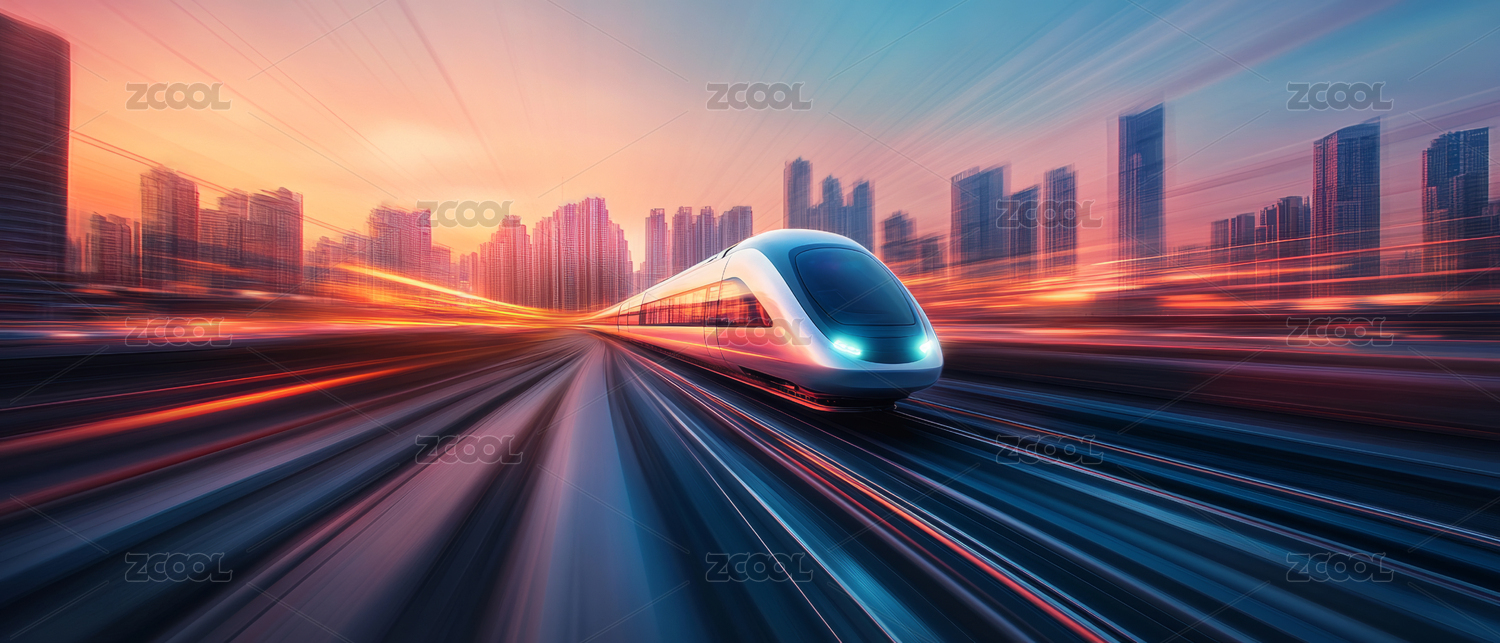 高速行驶,轨道,蓝色调,光影效果,动态模糊,列车外观,城市交通,未来感,科技感,窗户设计