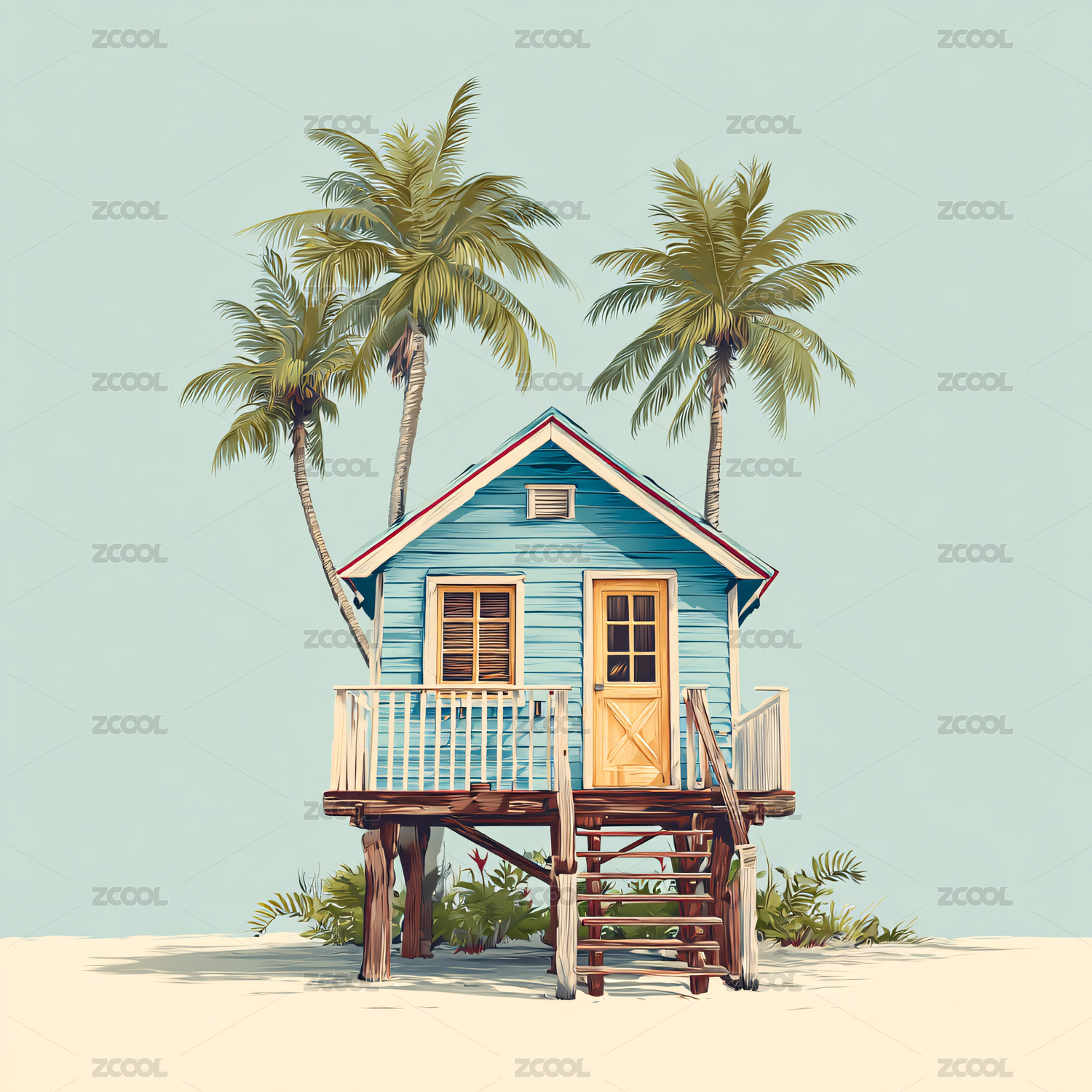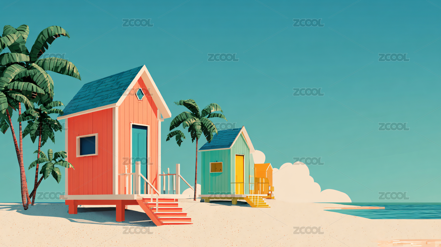 阳光沙滩海边小屋卡通场景