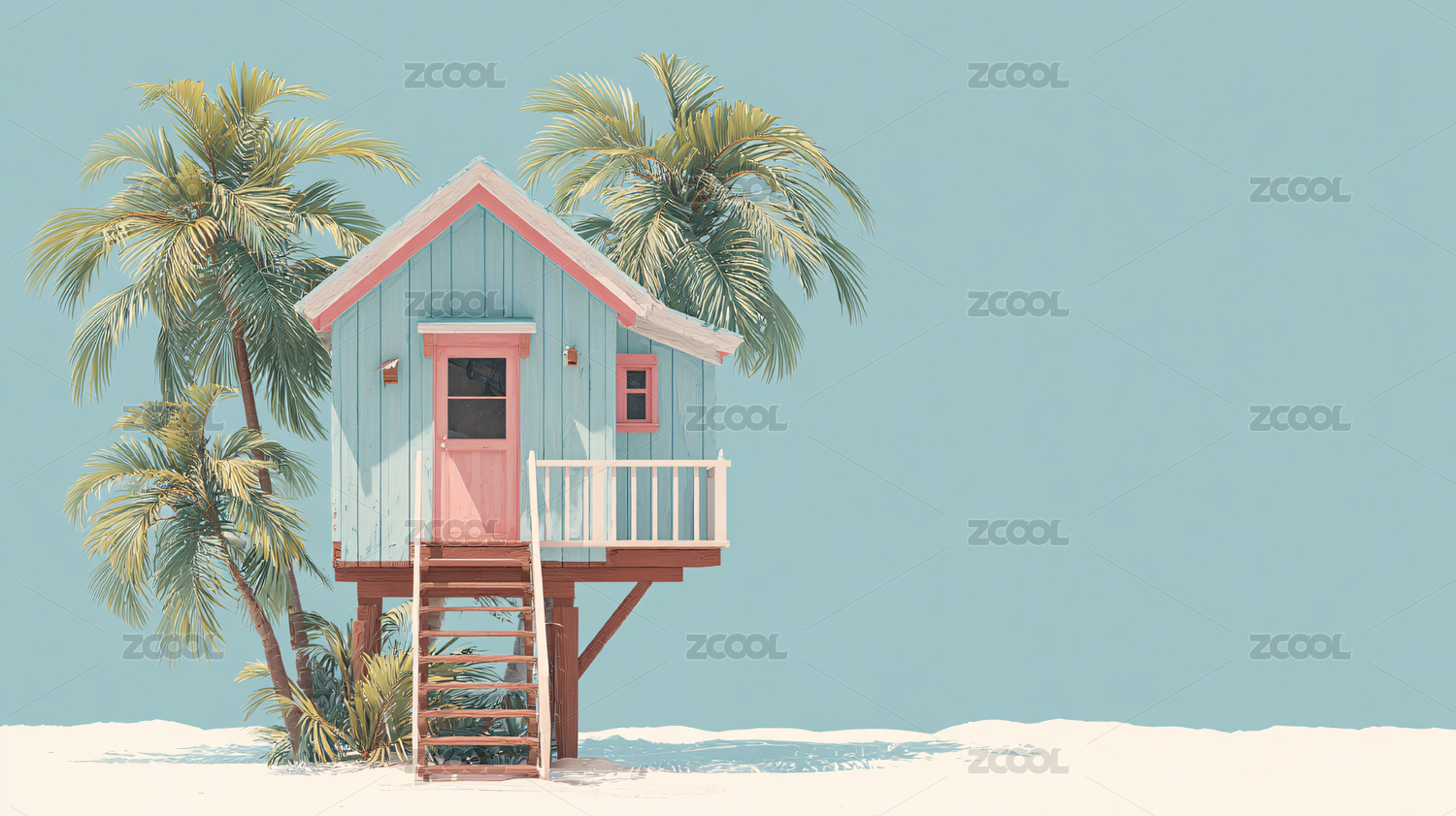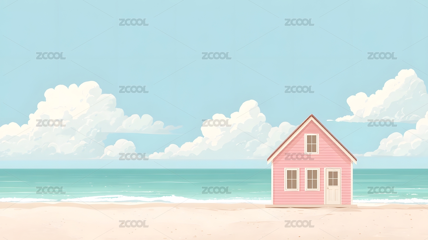 沙滩上的粉色小屋与蓝天白云