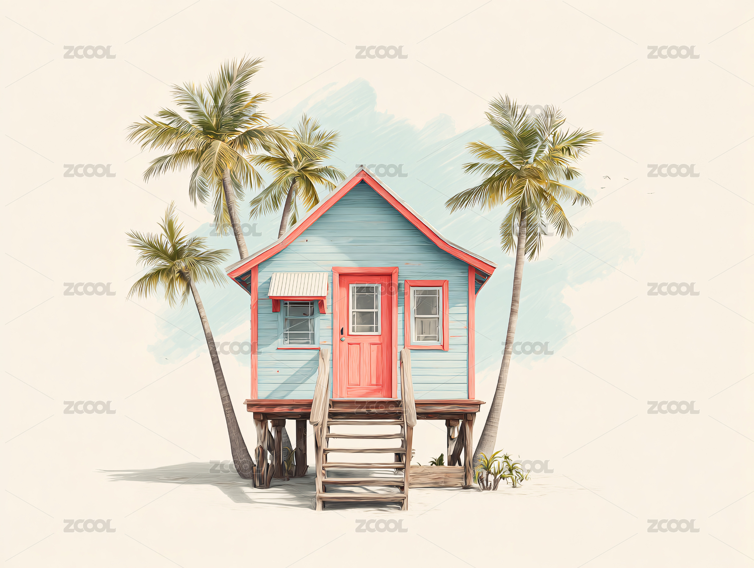 海滩小屋插画清新