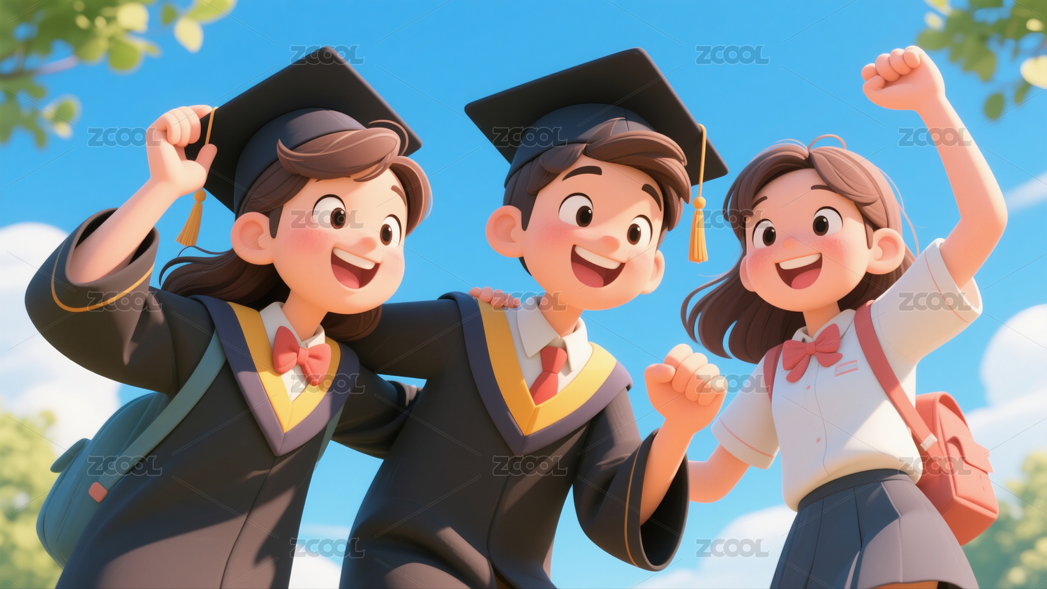 蓝色,天空,云彩,毕业,卡通,礼服,学士帽,微笑,黄色,纸条