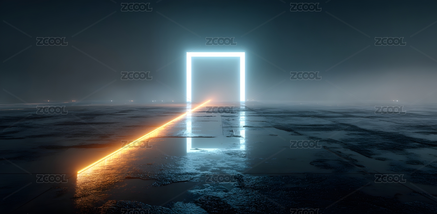 发光蓝门伫立于深邃空间 抽象科幻氛围
