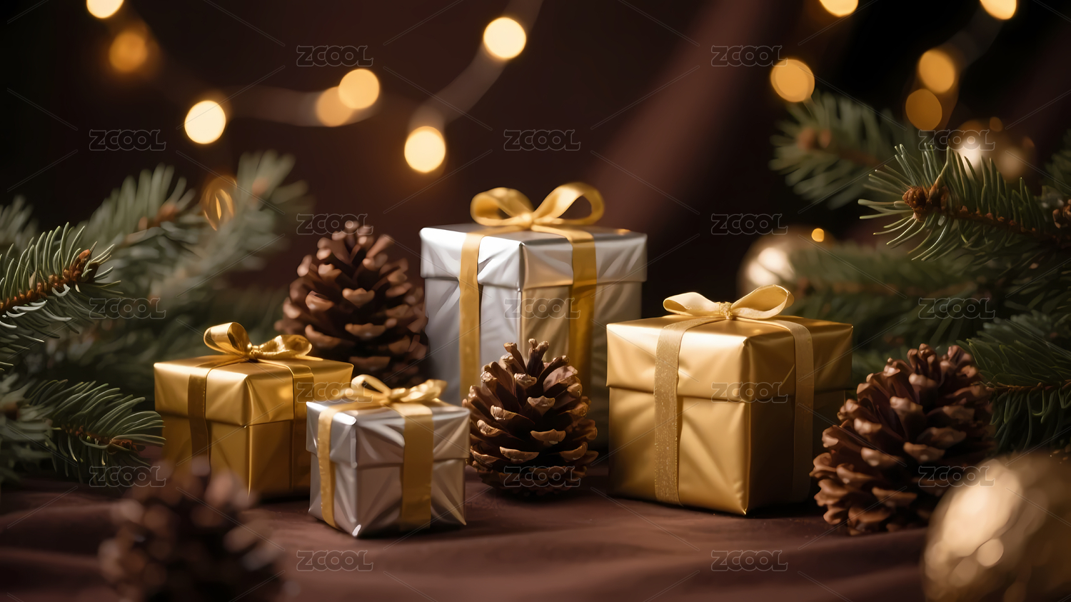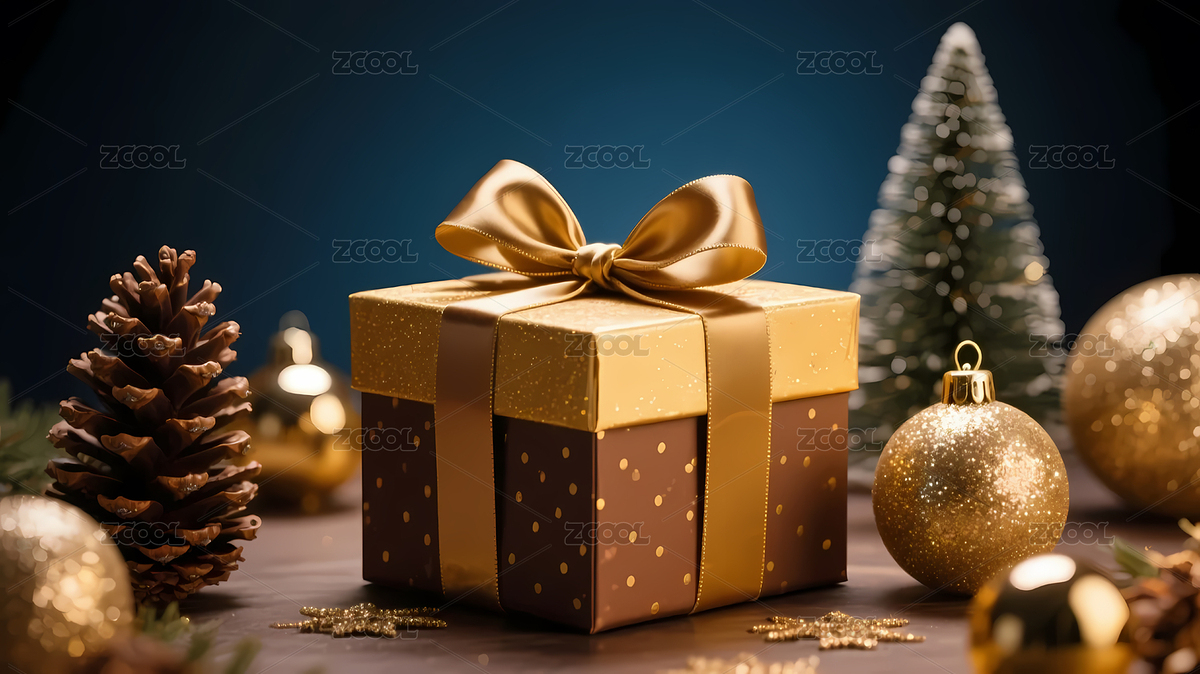深蓝,礼盒,蝴蝶结,松果,圣诞树,金色,装饰,节日,温暖,背景