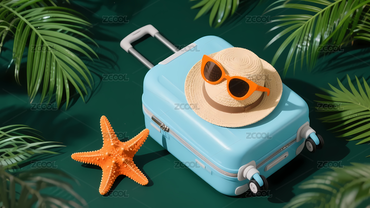 行李箱,草帽,海星,植物,蓝色,橙色,绿色,眼镜,叶子,度假