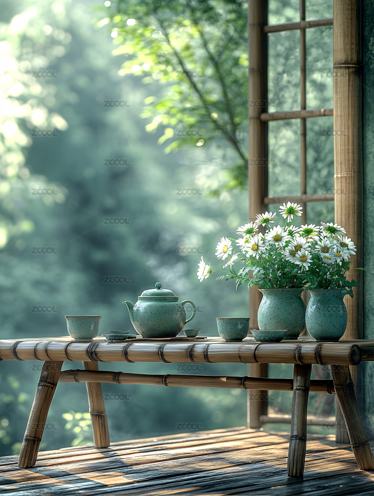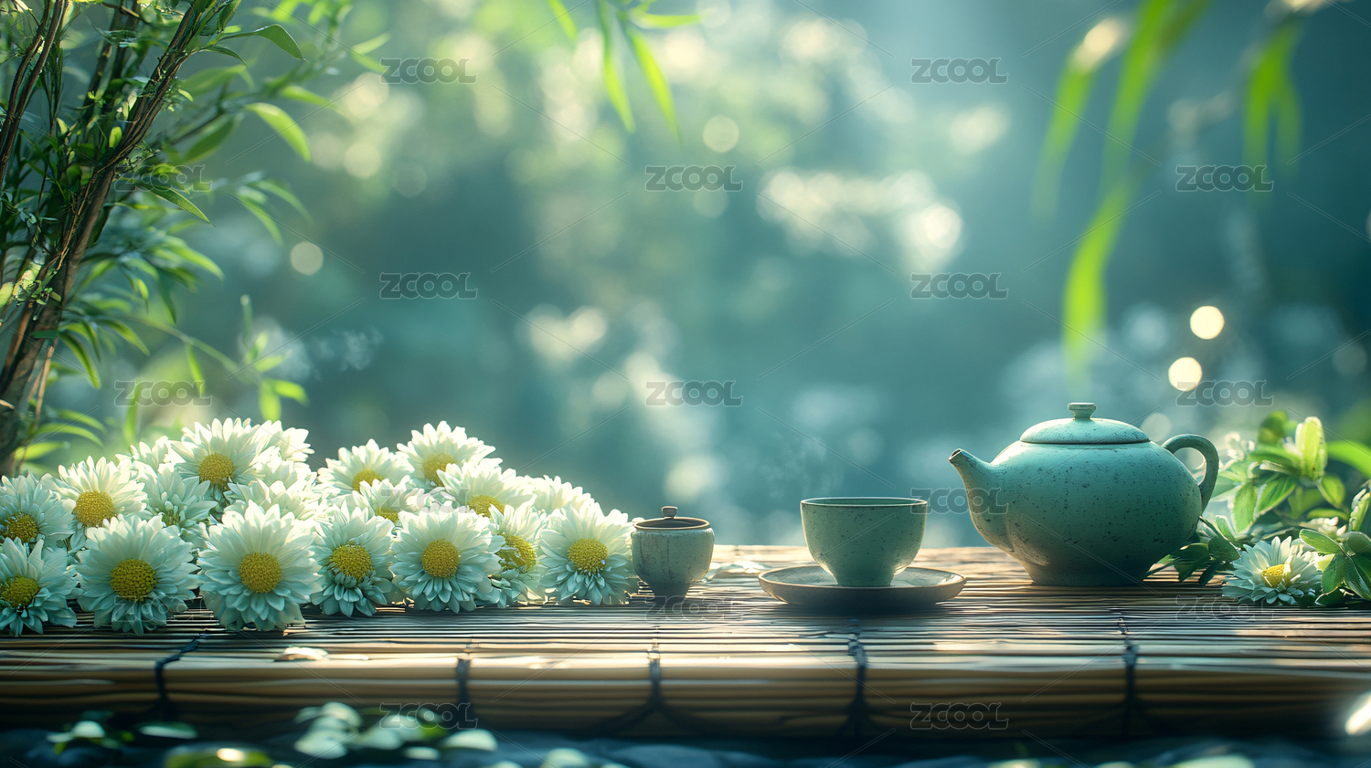 竹桌上的茶具和雏菊