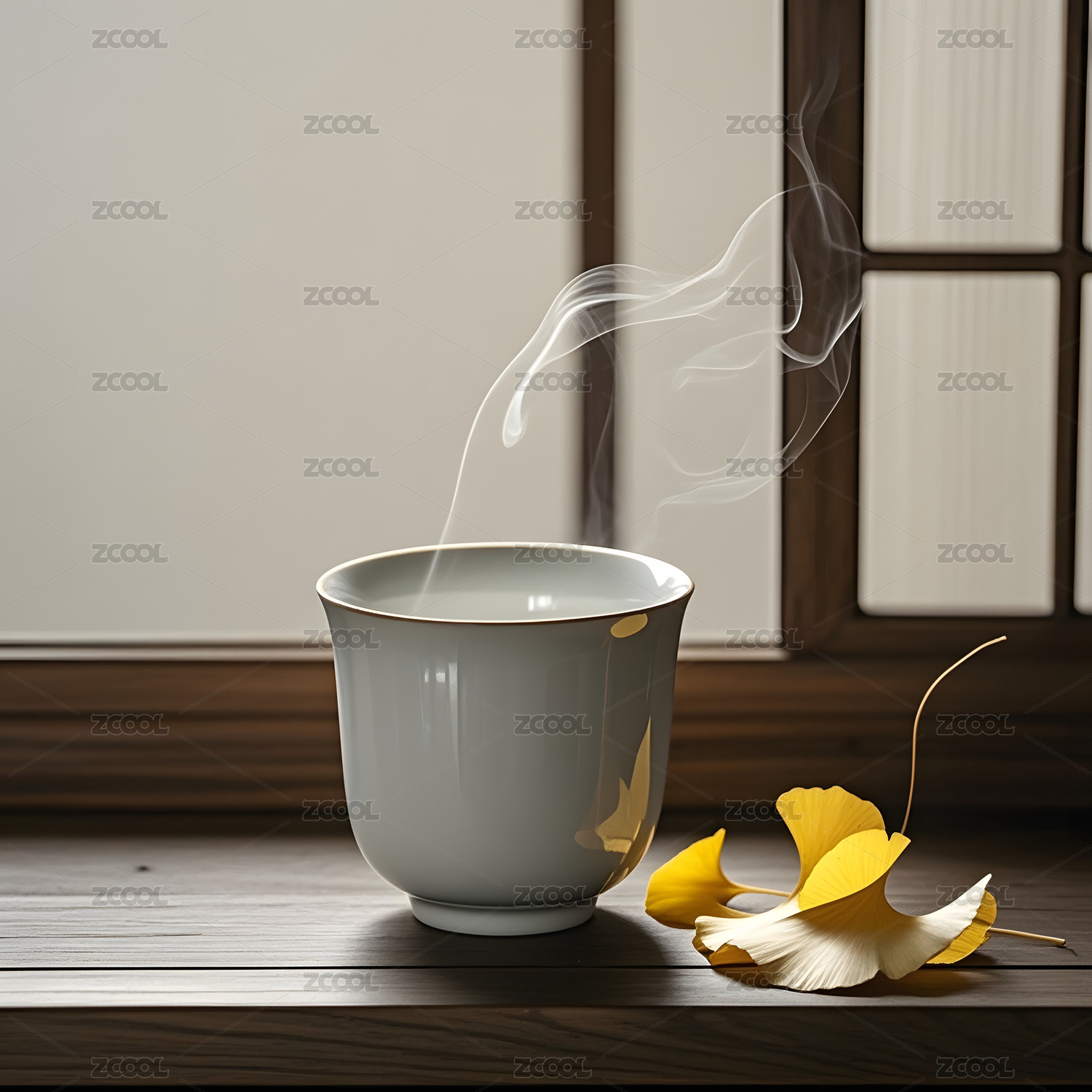 窗台茶杯与银杏叶图