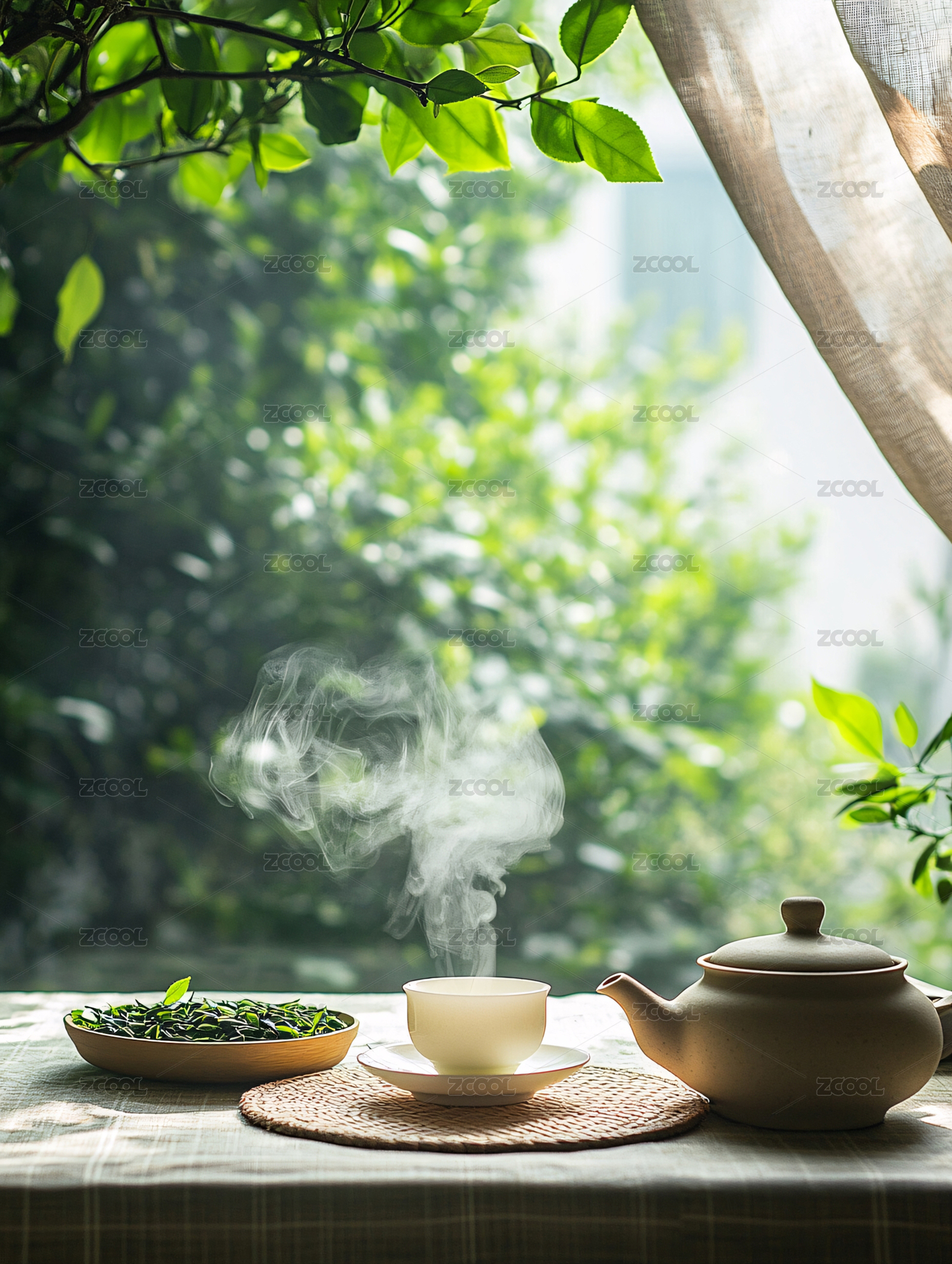 窗边一杯清茶绿意盎然