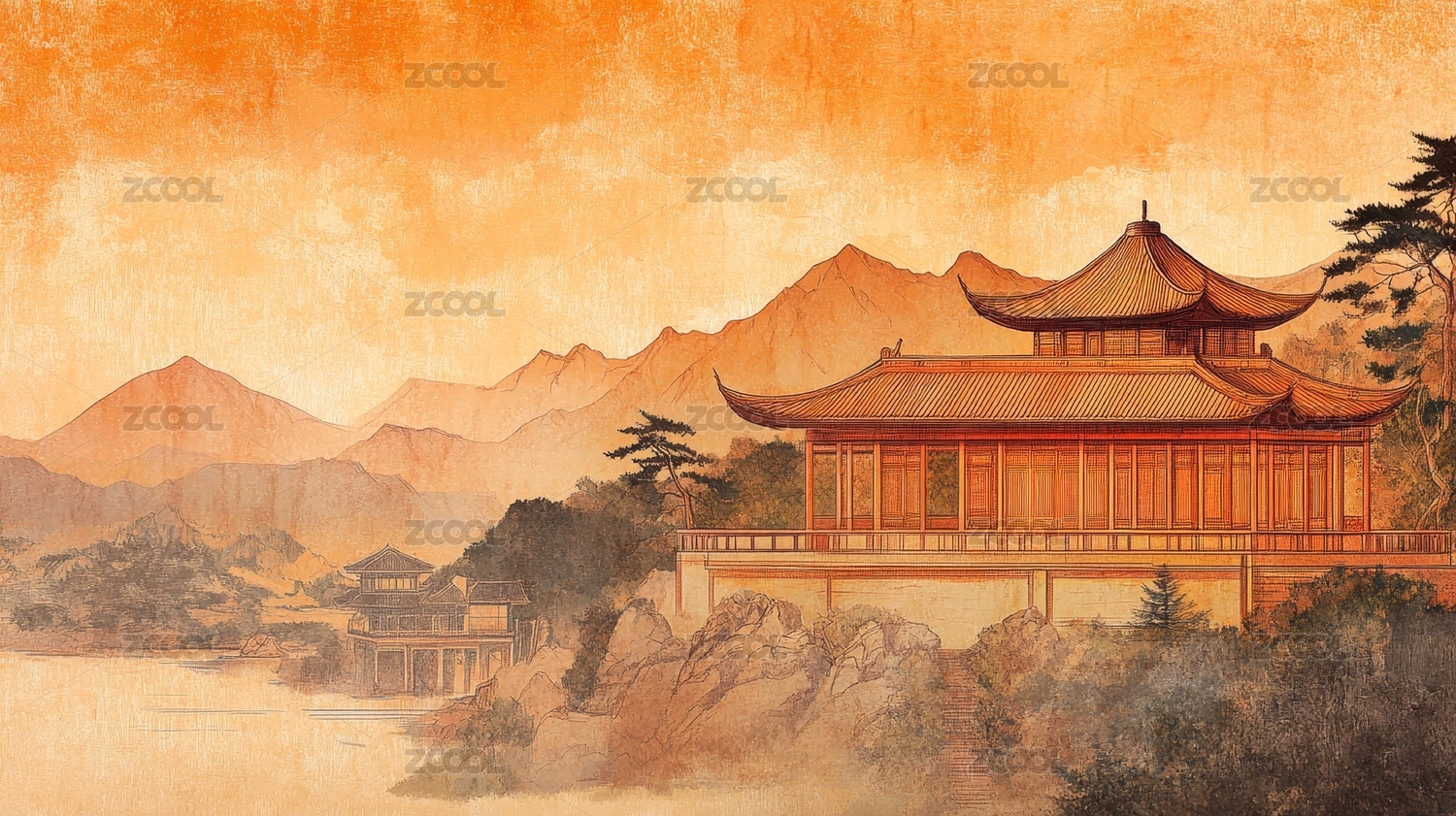 古典水墨画亭台楼阁