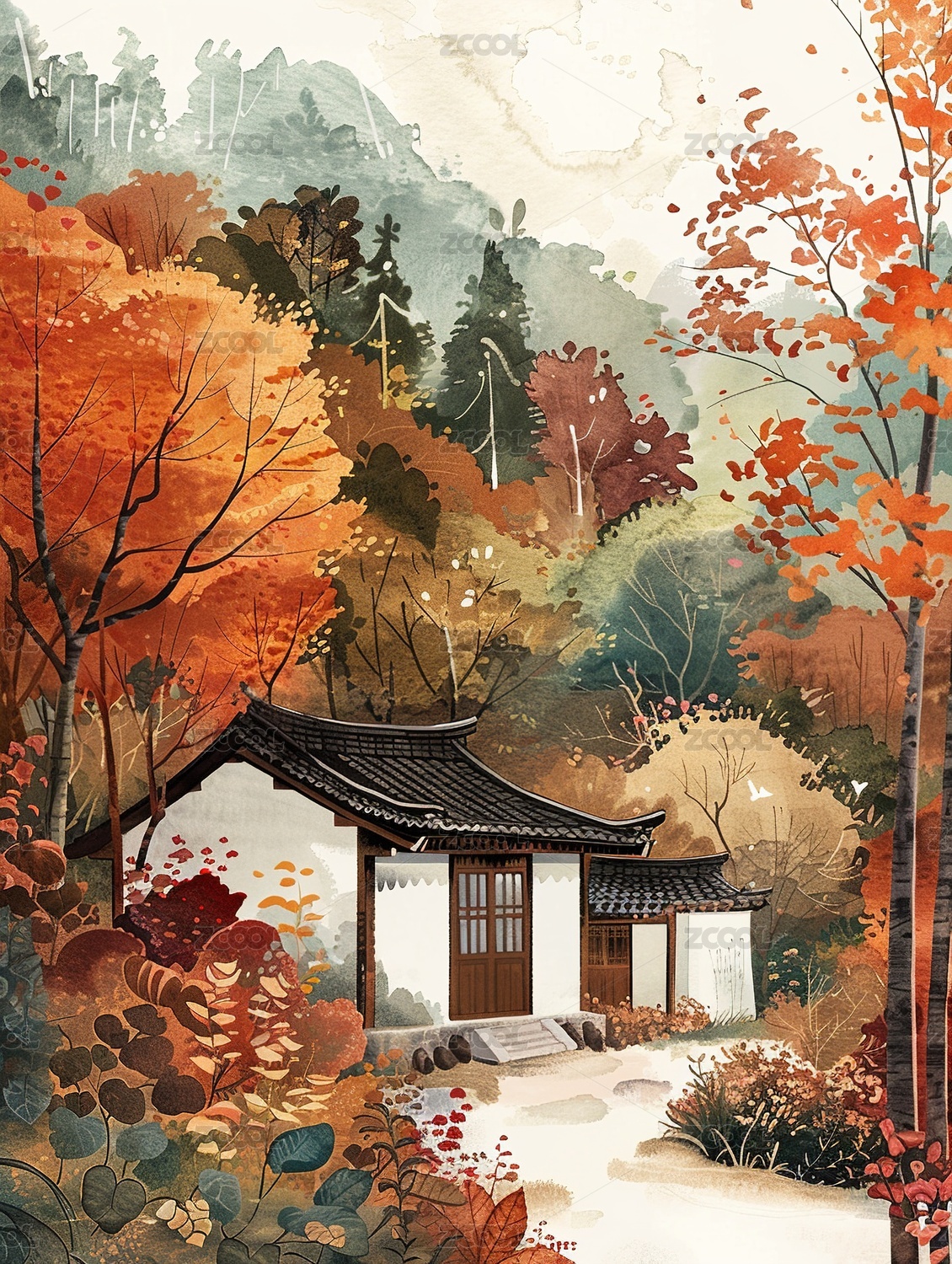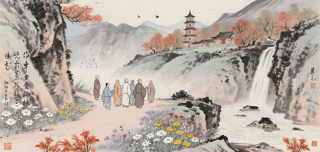 重阳节僧人在庭院中晾晒菊花水墨风格插画
