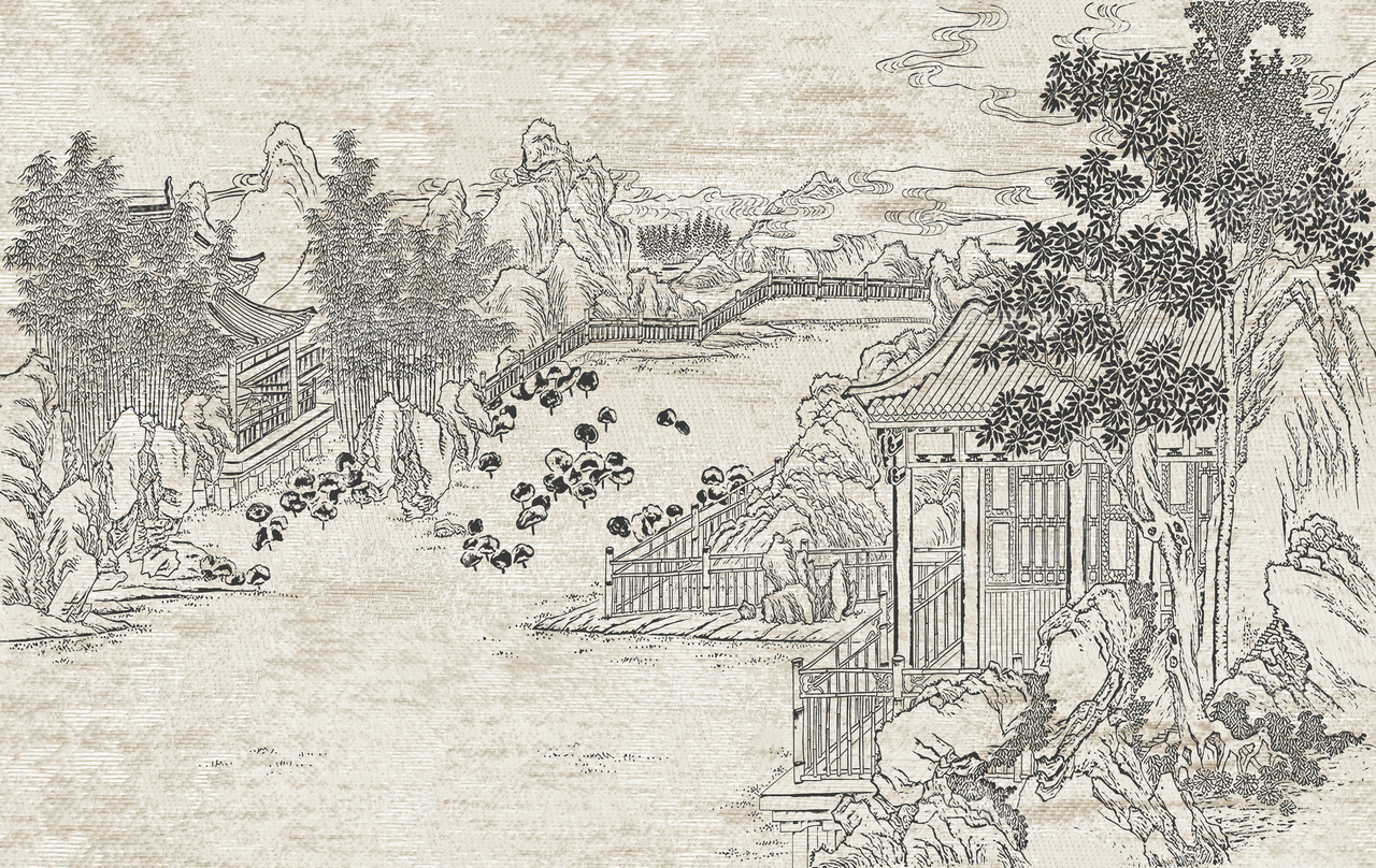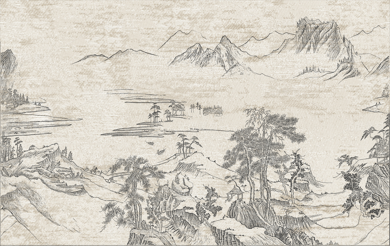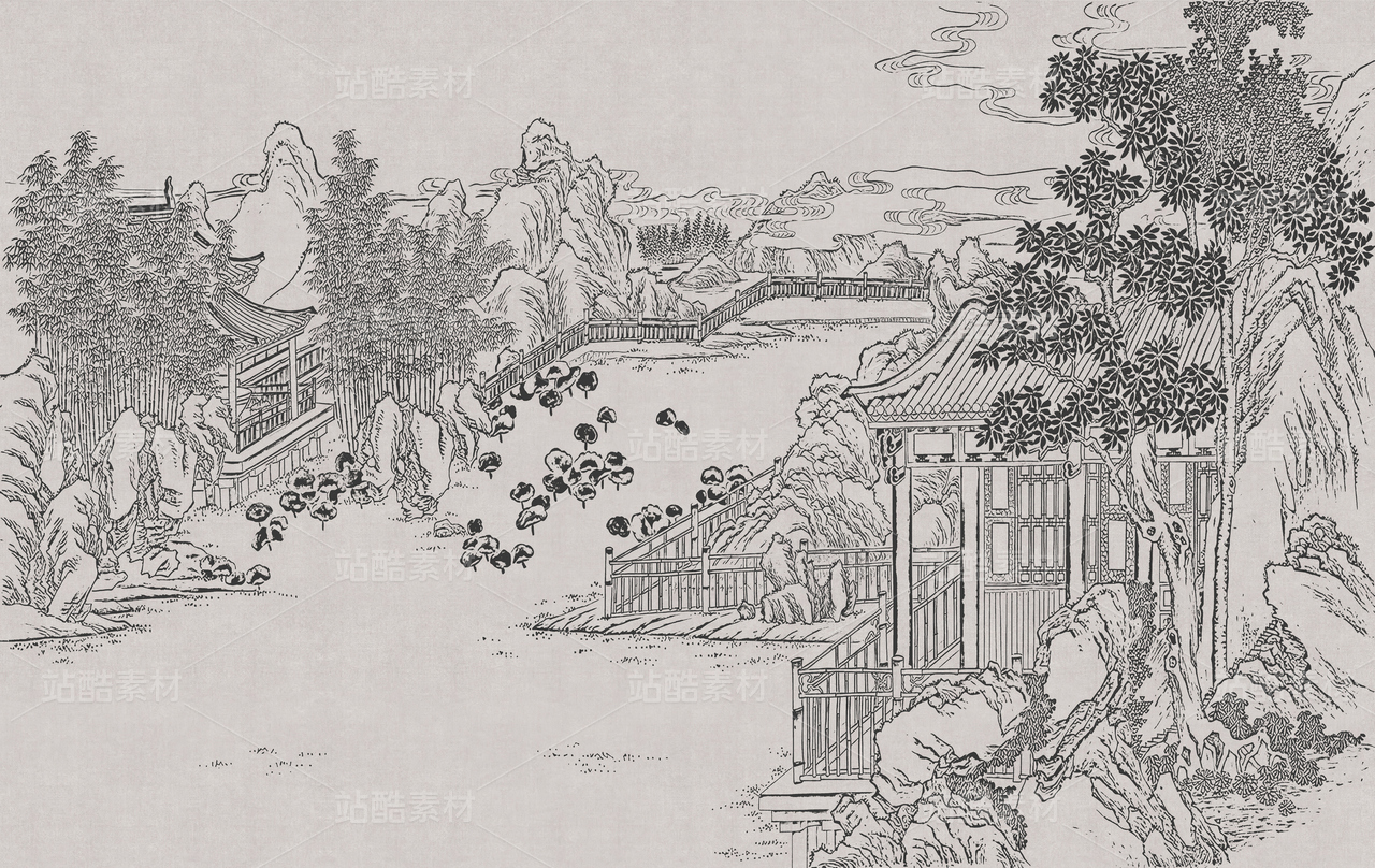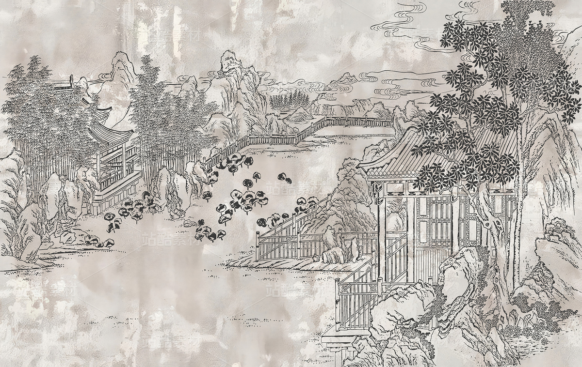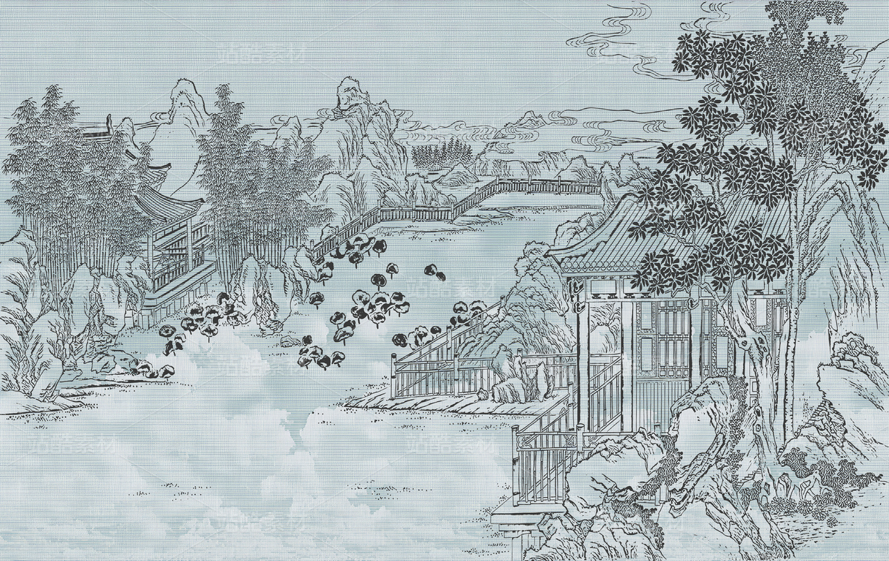 新中式国风亭台楼阁建筑工装背景墙壁画