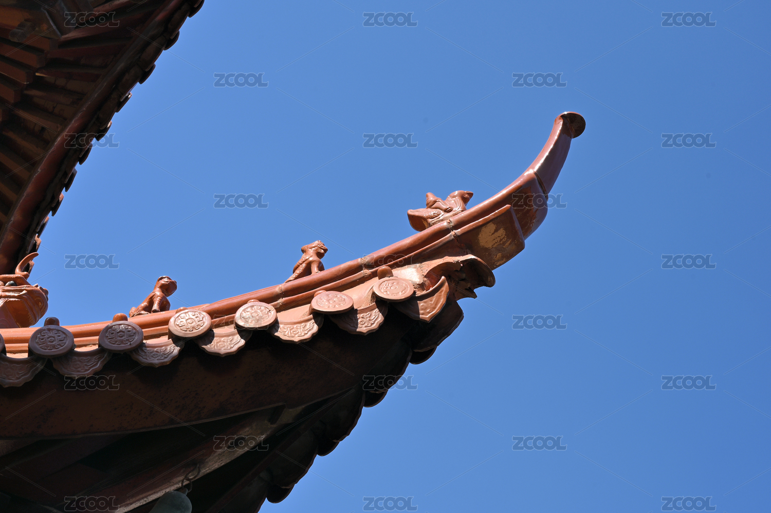 中国古寺庙建筑屋角飞檐琉璃瓦特写