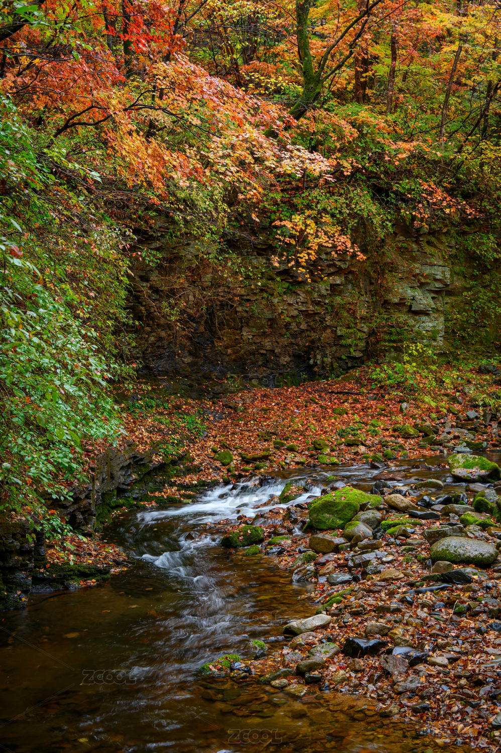 沈阳本溪老边沟,秋季枫树红叶溪流自然风光