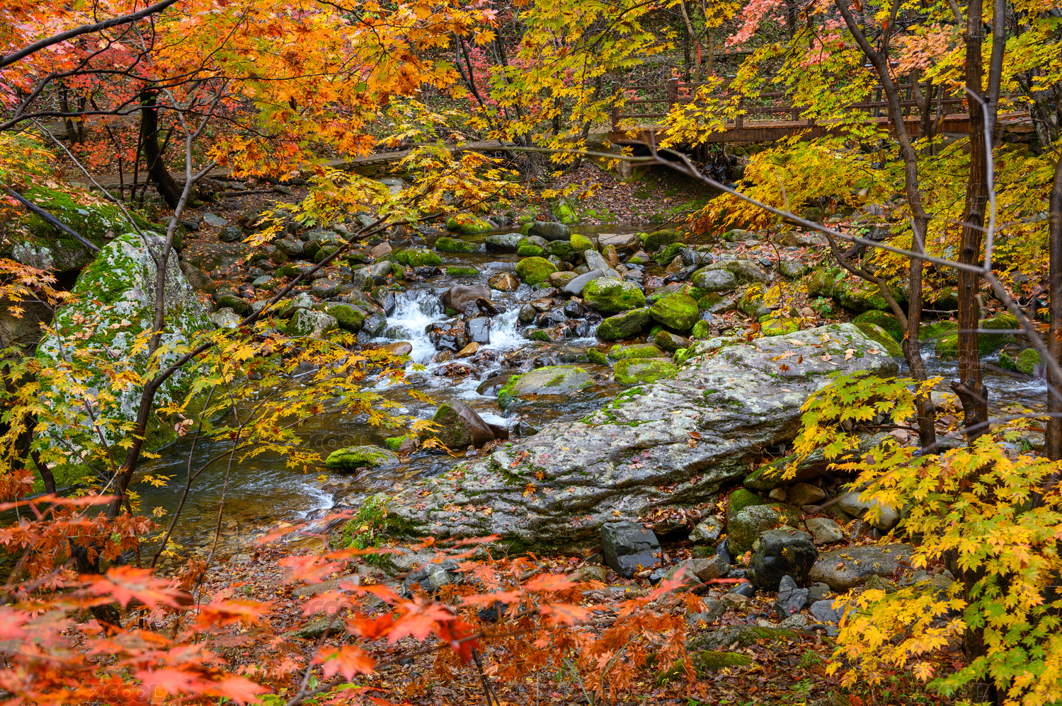 沈阳本溪老边沟,秋季枫树红叶溪流自然风光