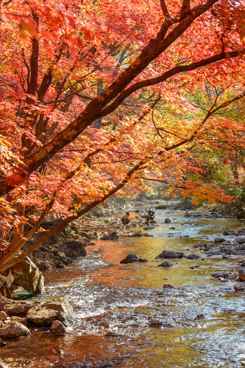 沈阳本溪老边沟,秋季枫树红叶溪流自然风光