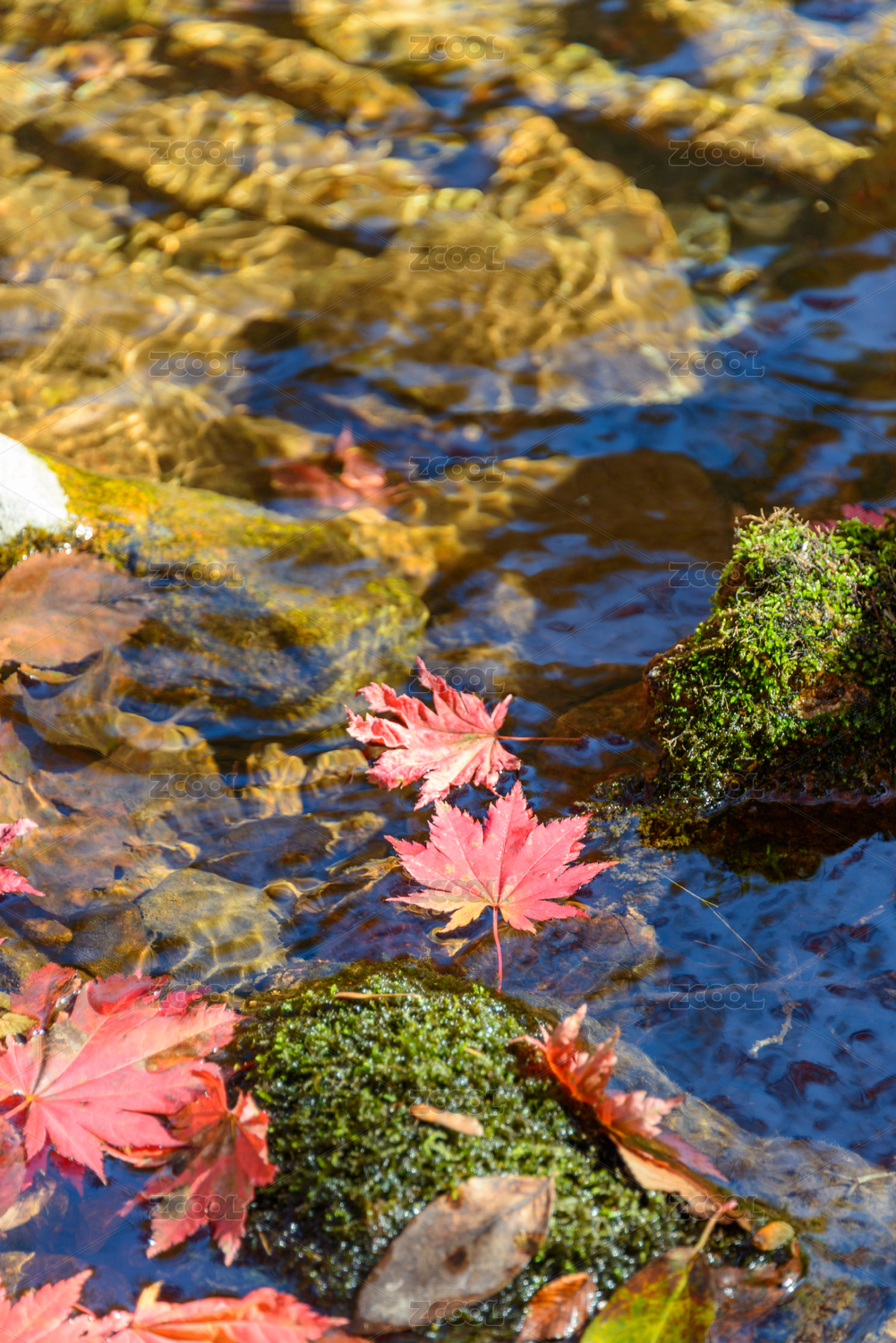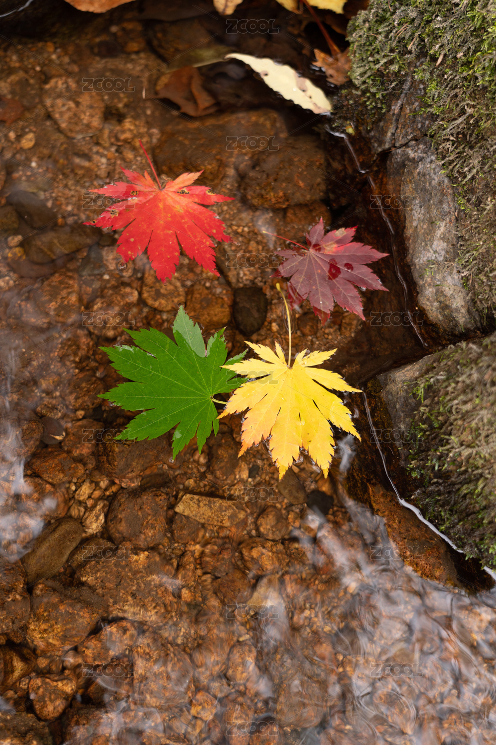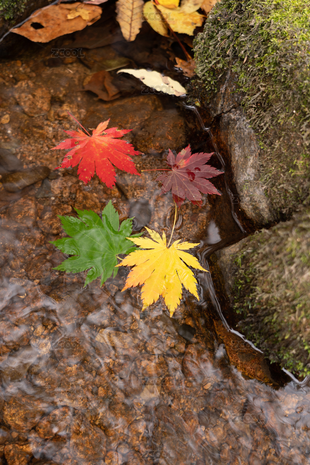 秋天山涧溪流里的红黄色枫树叶