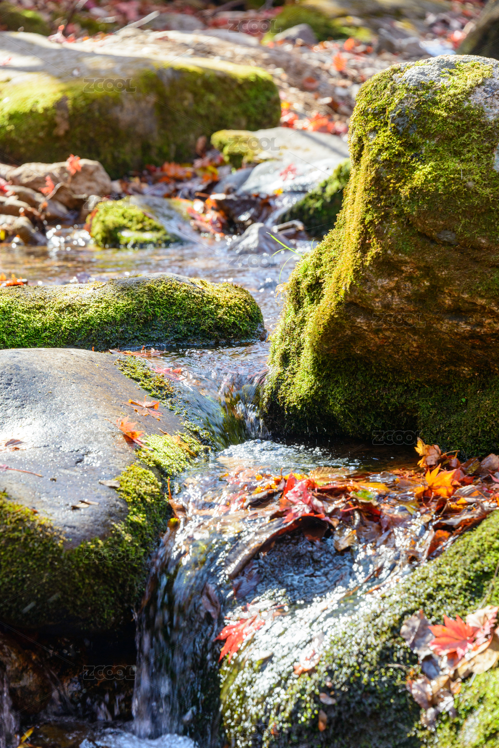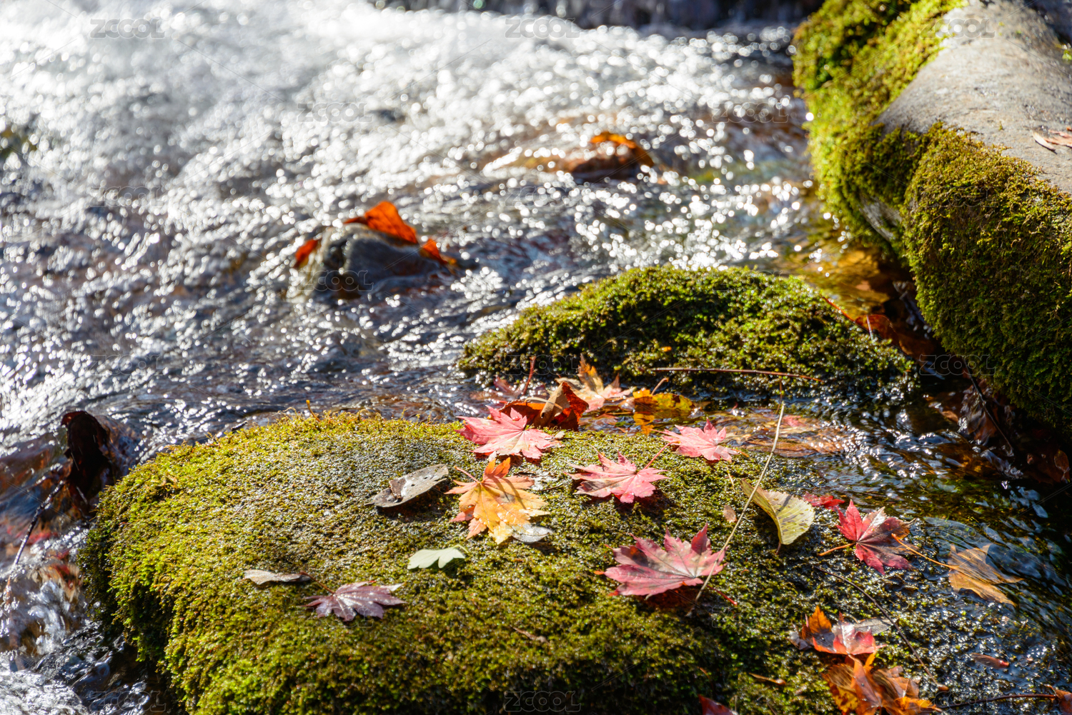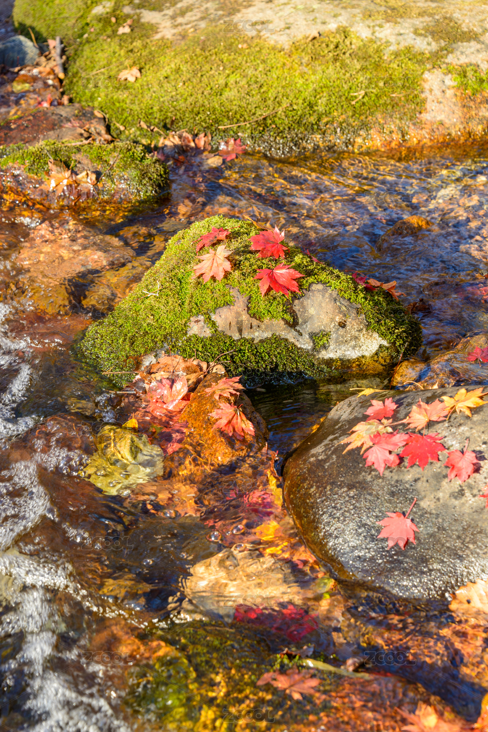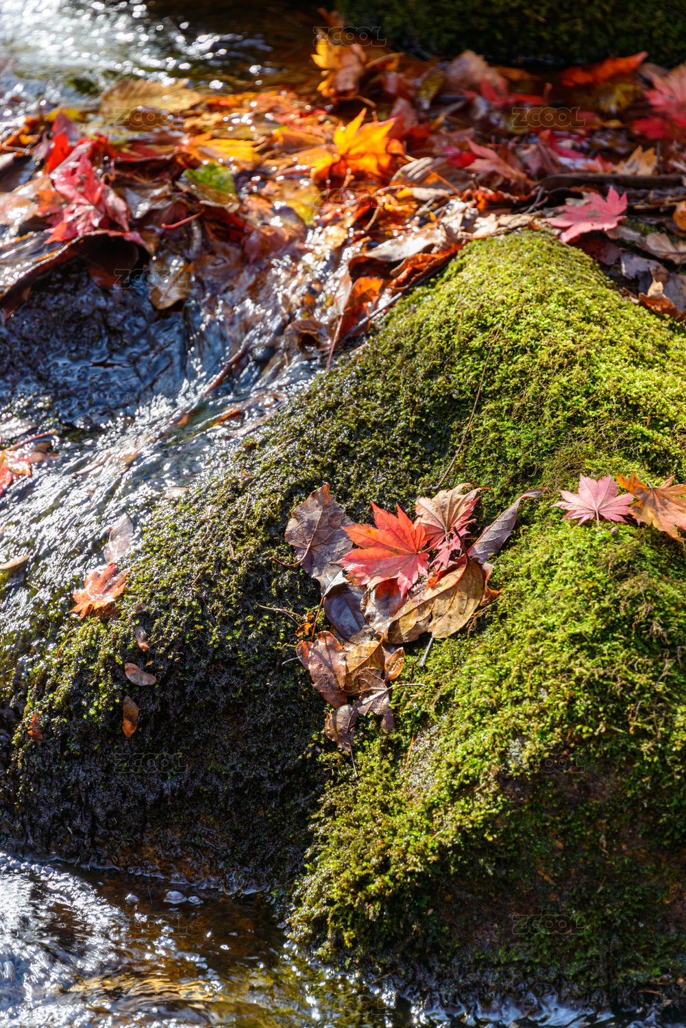 秋天山涧溪流里的红黄色枫树叶