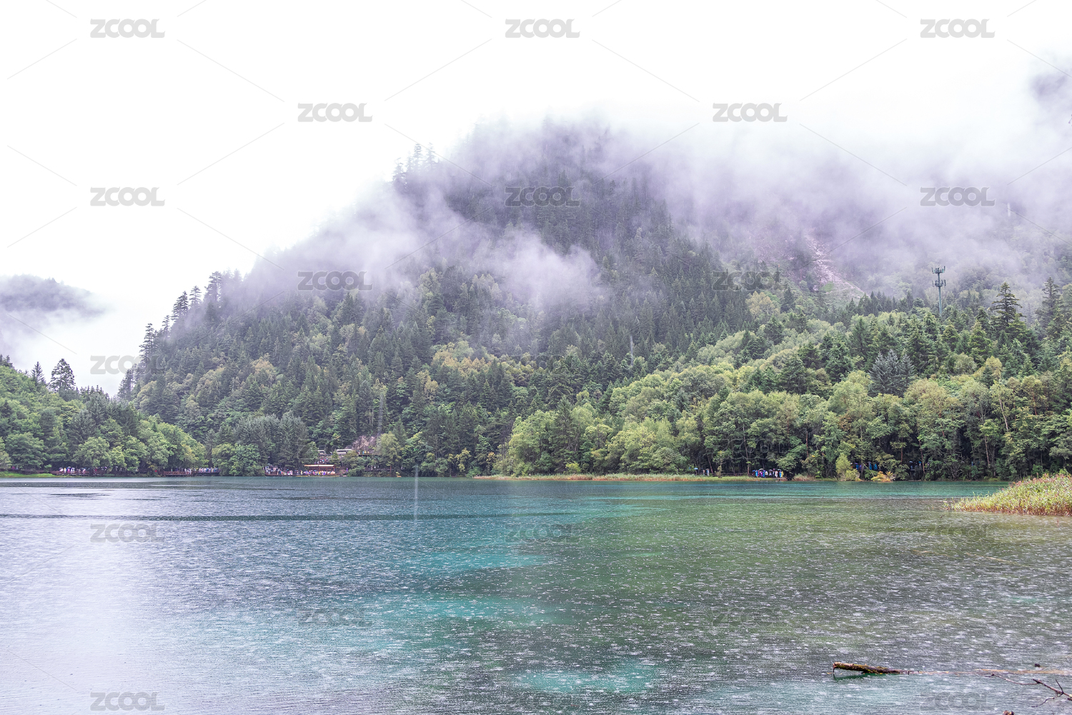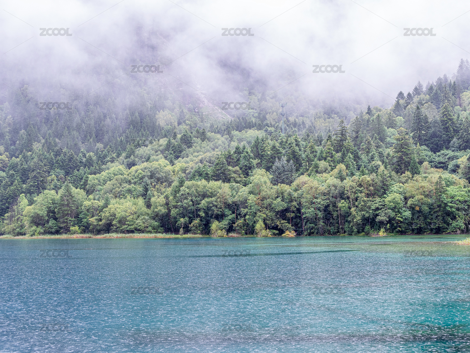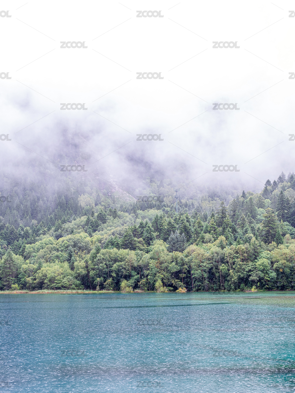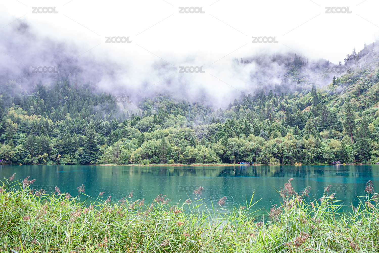 夏季九寨沟绿色的山峰和蓝色的湖泊以及湖边的植物